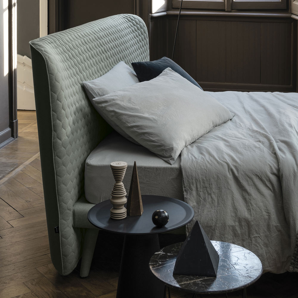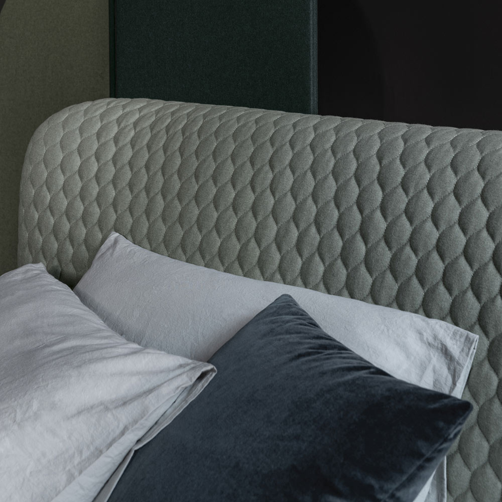 The Corolle double bed with a contemporary design has a sinuous line intertwined with an accurate chromatic choice. Soft lines, which we also find in the texture of the headboard.