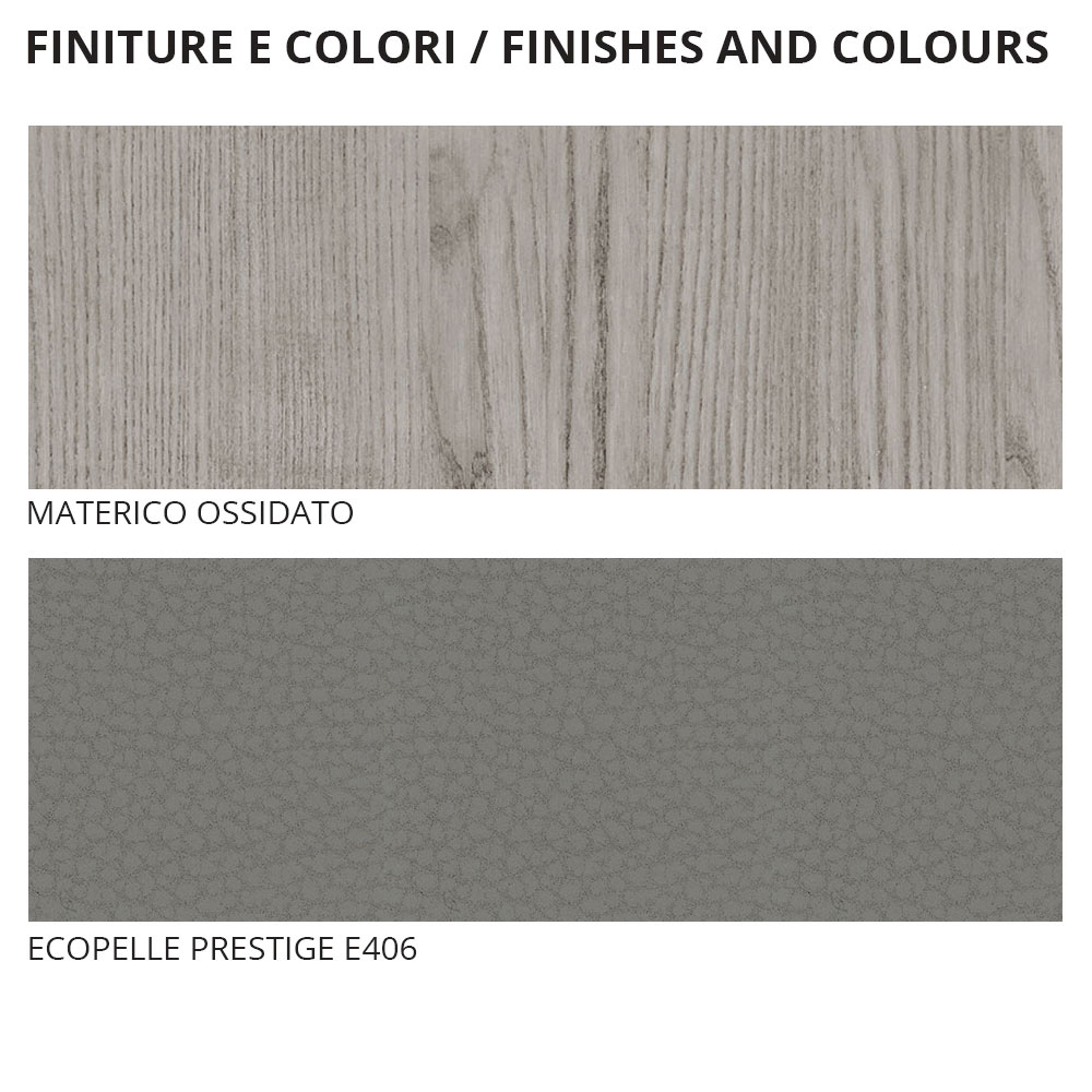 Complete double bedroom composed of 4 elements entirely made in Italy . The composition includes a double bed with a wooden structure with an oxidized material finish and a headboard with a padded panel covered in eco-leather, 2 bedside tables with 2 drawers each and a chest of drawers with 3 drawers in the same material and finish as the bed frame. A finished furniture able to complete bedrooms with a modern and refined aesthetic, ideal for those who love to enrich their domestic spaces with a touch of class . The wonderful harmony between the finishes and textures chosen creates a particularly welcoming atmosphere underlined by the elegant wood grain that envelops the entire room for an exclusive result with a strong visual impact while remaining on a sober and essential style .