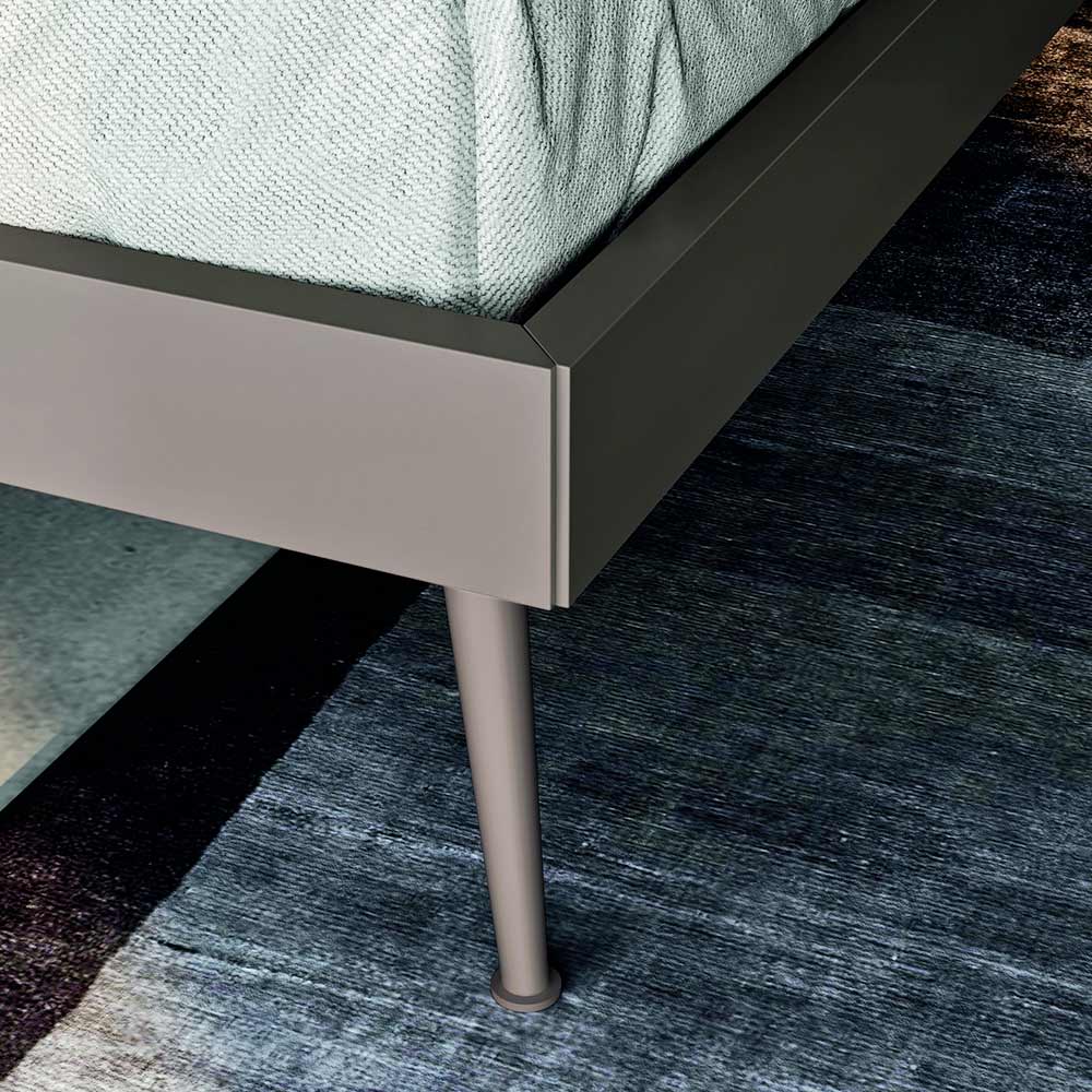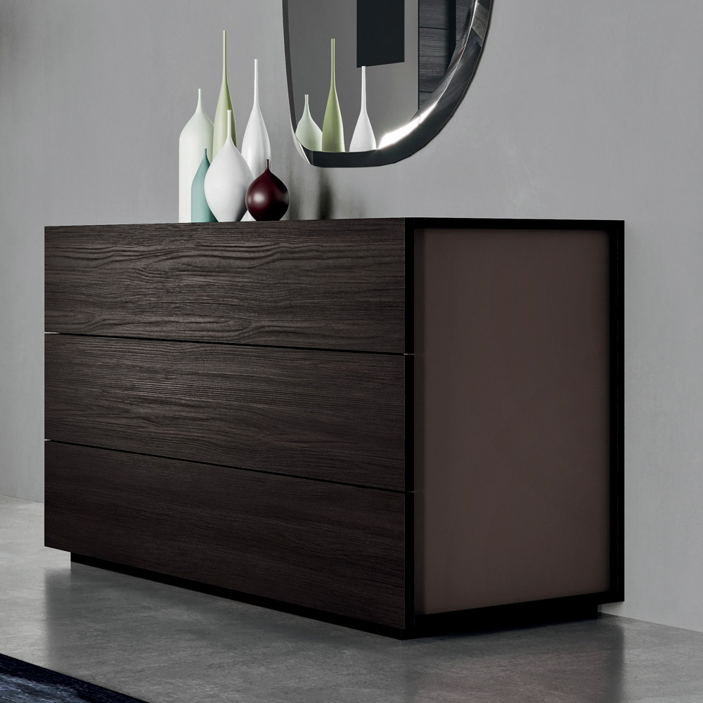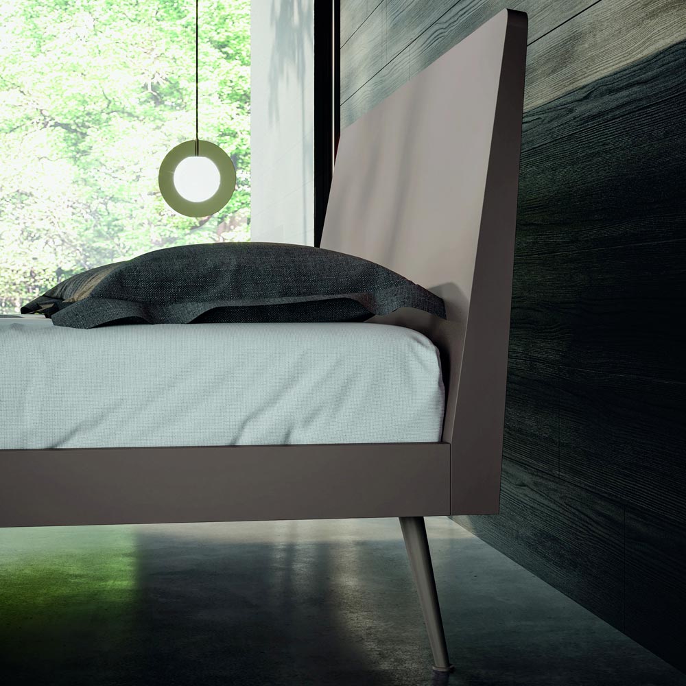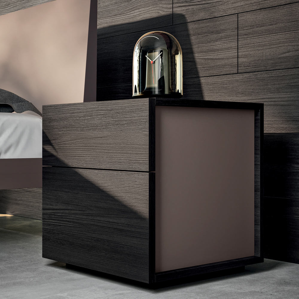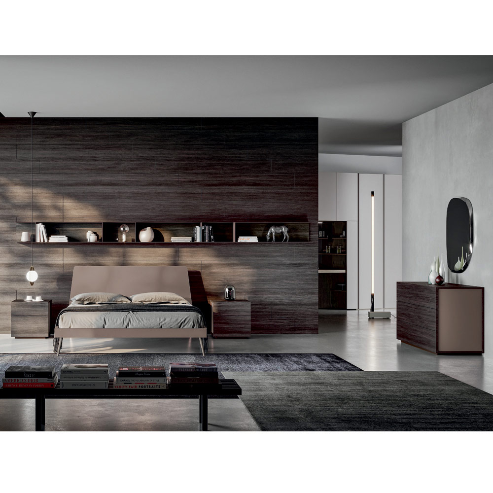 Complete double bedroom with 5 elements entirely made in Italy . The composition includes a double bed with bed frame, headboard and feet in clay matt lacquered wood , 2 bedside tables with 2 drawers each and a chest of drawers with 3 drawers in wood material finish coal and matt clay lacquer and a bevelled wall mirror. A sober and refined style characterizes this composition of furniture for the sleeping area, ideal for those looking for a design capable of enriching and revolutionizing the aesthetics of the room in an exclusive way and with personality. The bed, the undisputed protagonist of the environment, appears as a lively stain inserted within a simple and at the same time unique context in which the finishes play in perfect harmony with each other. The elements that surround it are equally essential in shape but prove to be the result of a precise ergonomic study on the opening of the drawers.