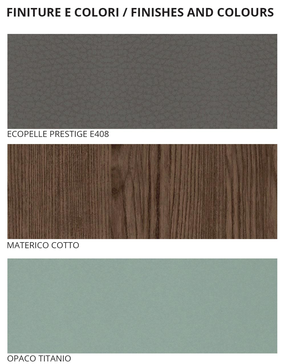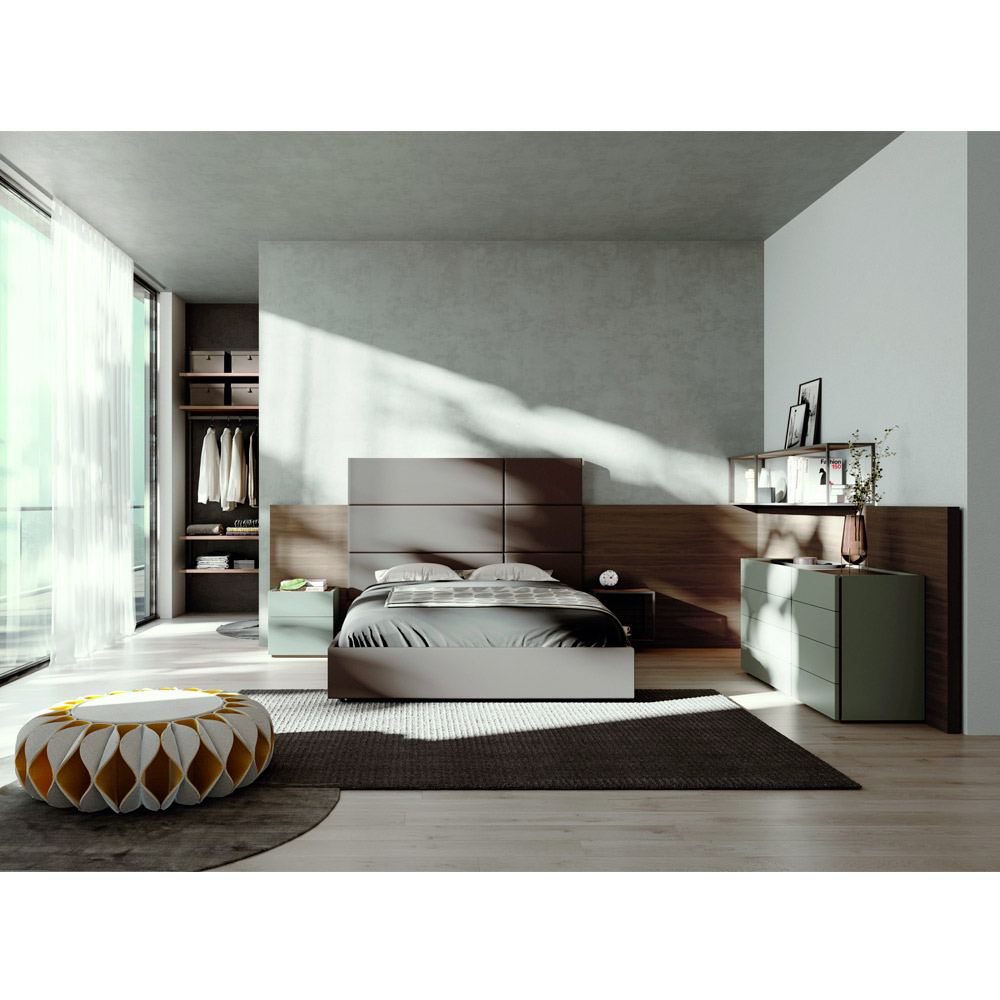 Bedroom furniture made up of 5 elements entirely made in Italy . The composition includes a double bed with a padded bed frame covered in eco-leather , a bedside table, two wall units and an 8-drawer chest of drawers in matt lacquered wood with a titanium finish and textured terracotta details. A solution for furnishing the sleeping area with an essential design that is characterized by a refined mood in which to rediscover the pleasure of fully experiencing your bedroom in the name of comfort , practicality and elegance . A bed, the protagonist of the room, with comfort and exclusive aesthetics completed by elements capable of furnishing while fulfilling the function of containment for a personalized result that will tell of a contemporary taste .