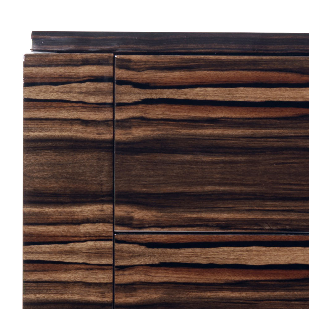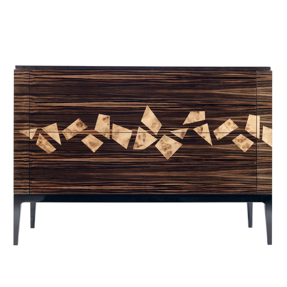Four drawers design dresser with a multilayer veneered ebony wood structure with coriander inserts in Ferrarese walnut briar.