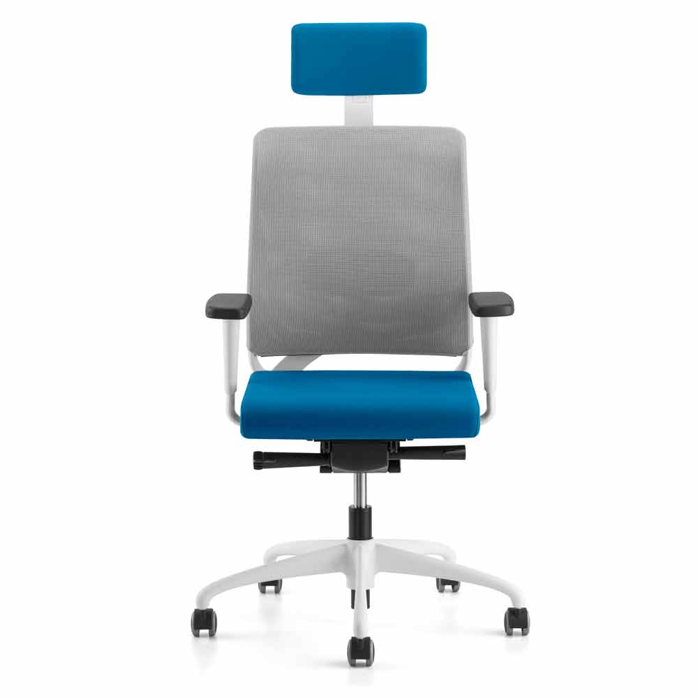• structural elements such as backrest, base, armrests and headrest in white finish and blue fabric