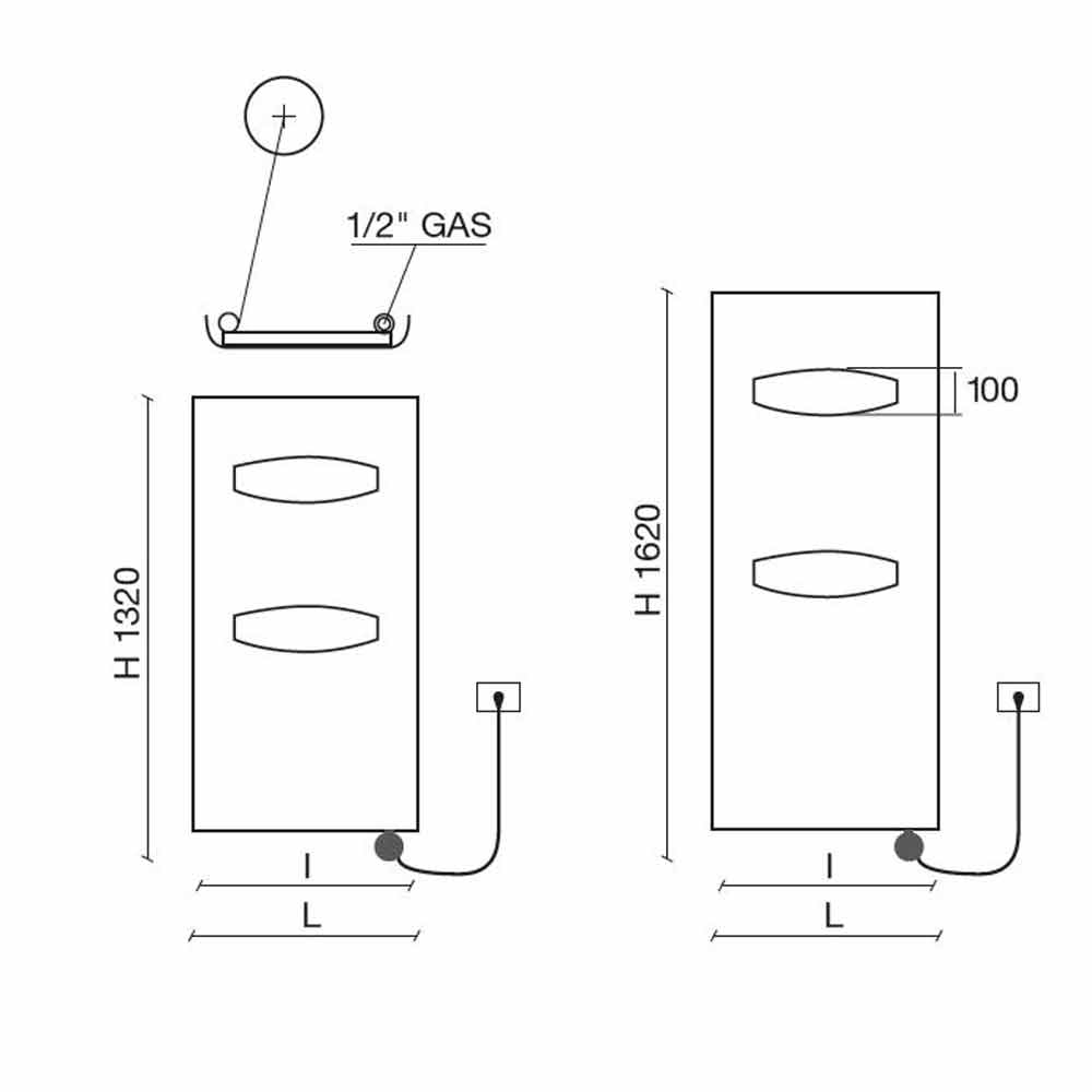 The 110 mm thermostat must be added to the height. White thermostatic box as standard for white radiators; chrome for the colored radiators and stainless steel finishes. Single-phase 230 volt power supply.