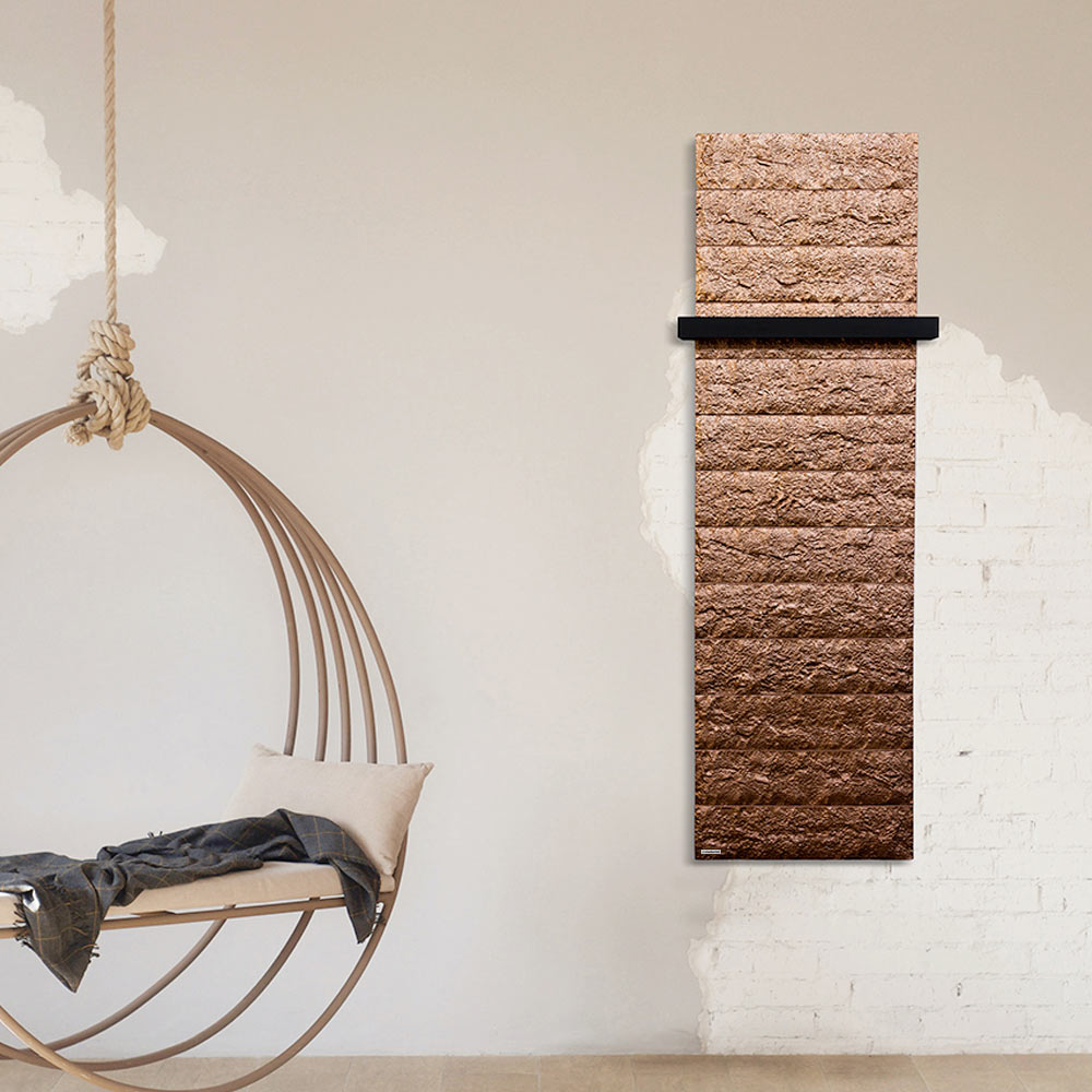This electric radiator made in marble powder shows an irregular surface which enhances a rustic but modern effect. An entirely Made in Italy production that combines design, functionality and technology to promote an experience of welcoming well-being, accentuated even further by the wireless magnetic thermostat that regulates the temperature reached, reducing energy consumption.
