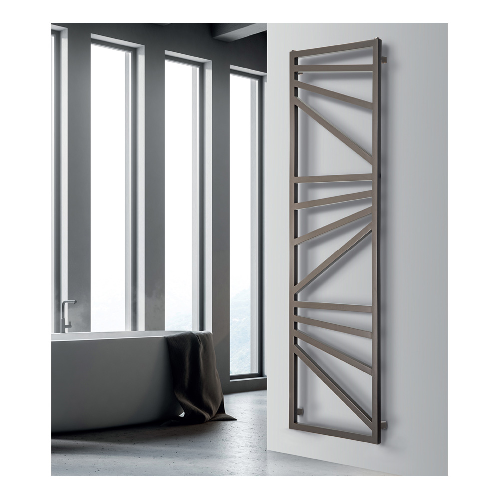 Electric towel warmer in carbon steel gray beige finish with 3 cm square section elements entirely made in Italy with wall fixing kit included . Electrification kit positioned at the bottom right.