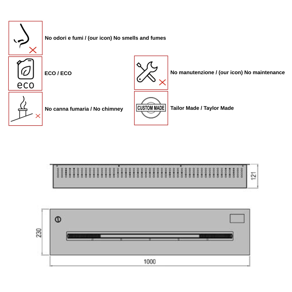 Electronical recessed burners with a remote control, made in brushed stainless steel and suitable to be embedded on flat surfaces or in custom made wll fireplaces. For larger fireplaces it is possible to combine several burners in line. The switching on and off the fire is obtained by operating a remote control, which regulates the three powers of the flame.