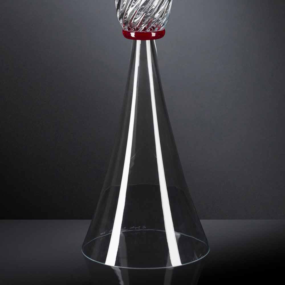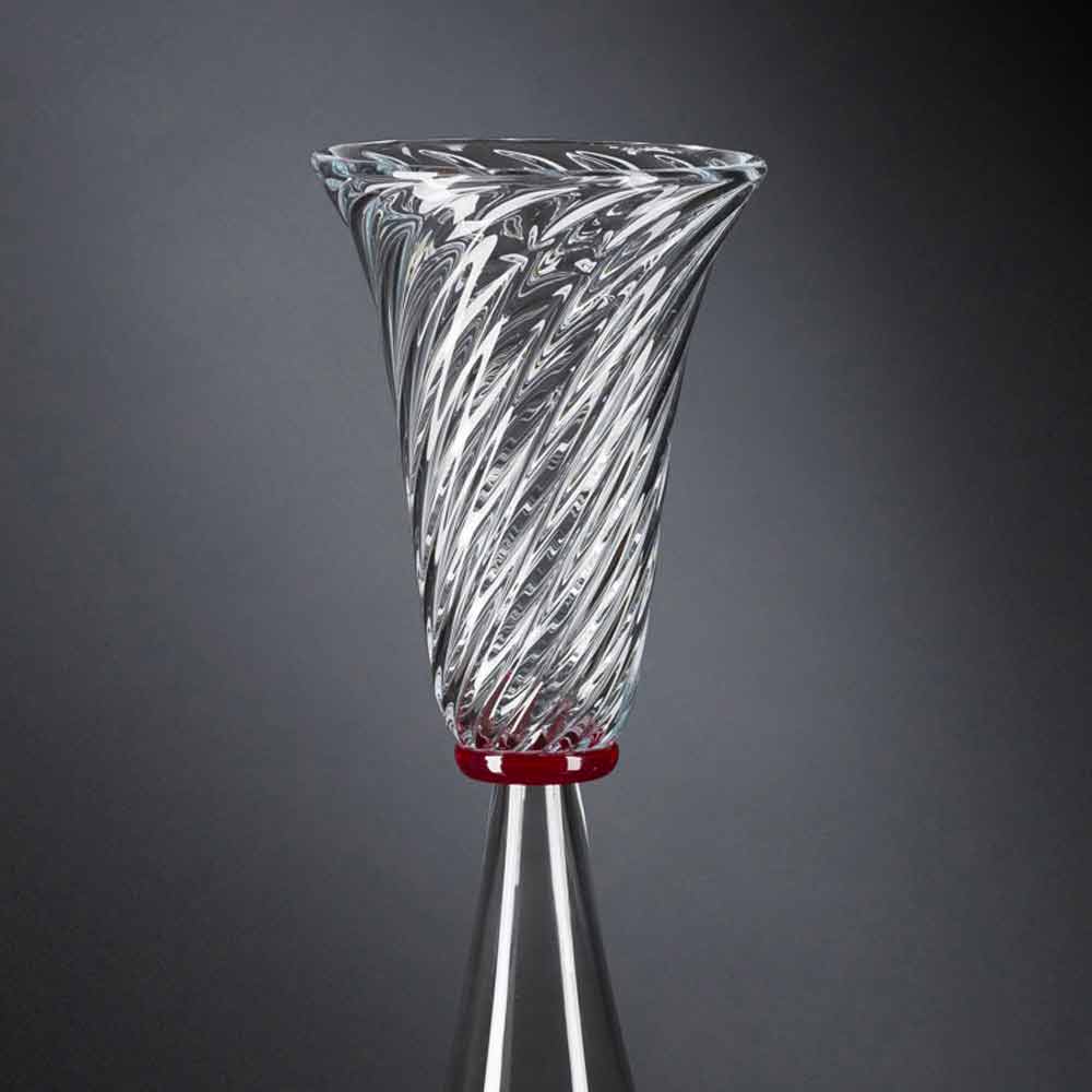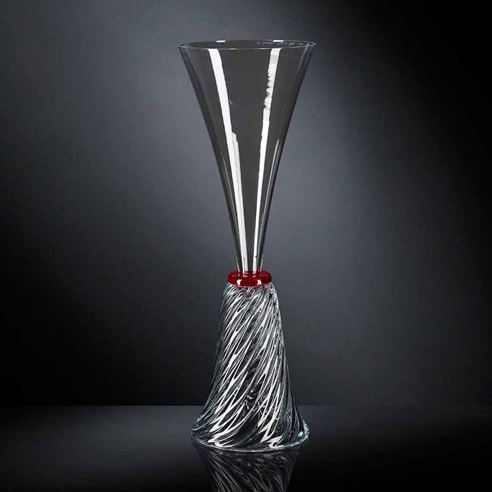 Elegant indoor vase made of transparent Murano blown glass with red detail through a process entirely Made in Italy . A unique and refined design that recalls the shapes of an hourglass revisited in a contemporary key to give life to an idea of exclusive and avant-garde furniture. Its aesthetic proves to be particularly versatile thanks to the neutral finishes used which at the same time emphasize its value and high quality together with the wonderful workmanship that characterizes the upper part of the vase. An ideal style for the most varied environments, from home furnishings to that of hotels, restaurants, contract areas, spas but also as a setting for events and weddings.