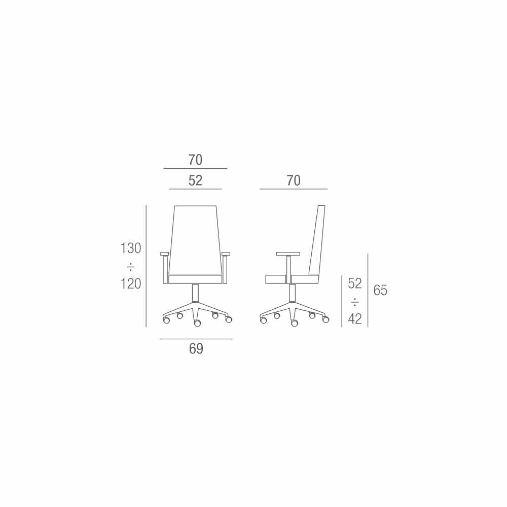 Measures L.tot 69cm x L.sitting 52 cm x H.tot 130/120cm x h. sitting 52/42cm x h.armrests 65cm