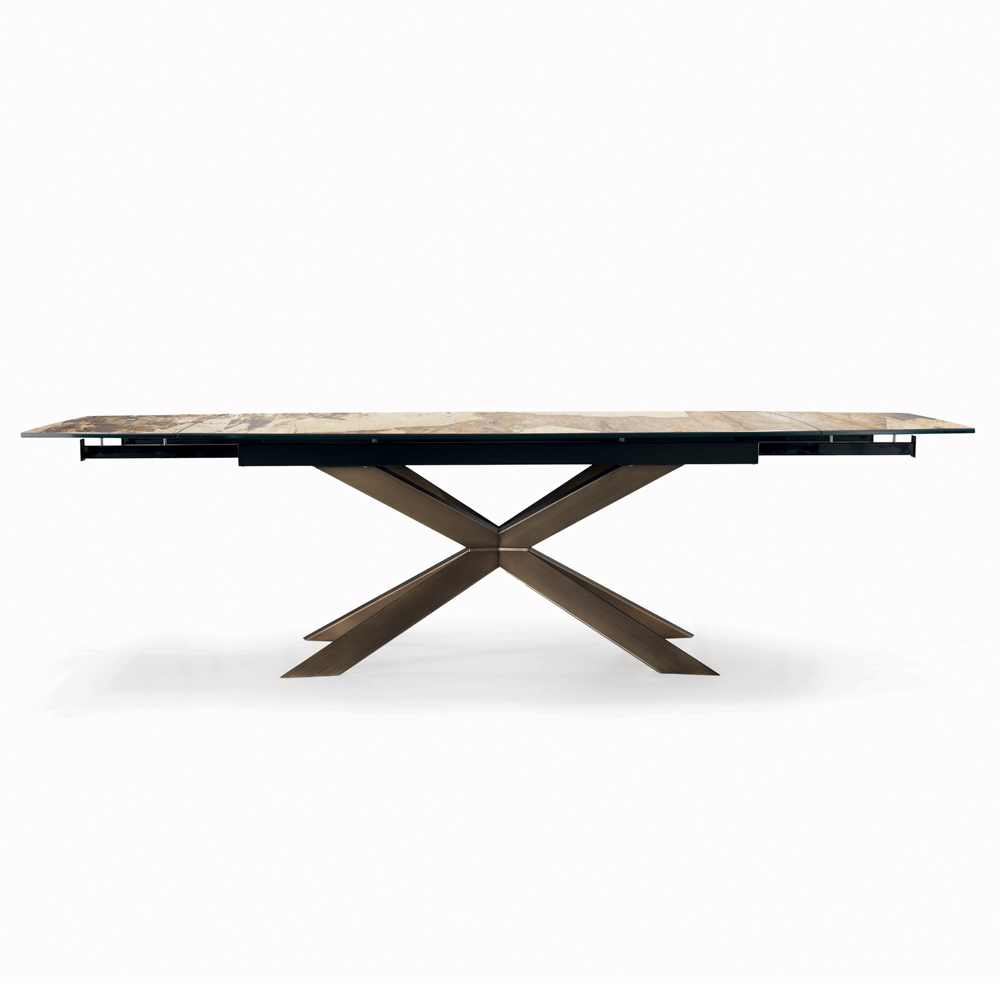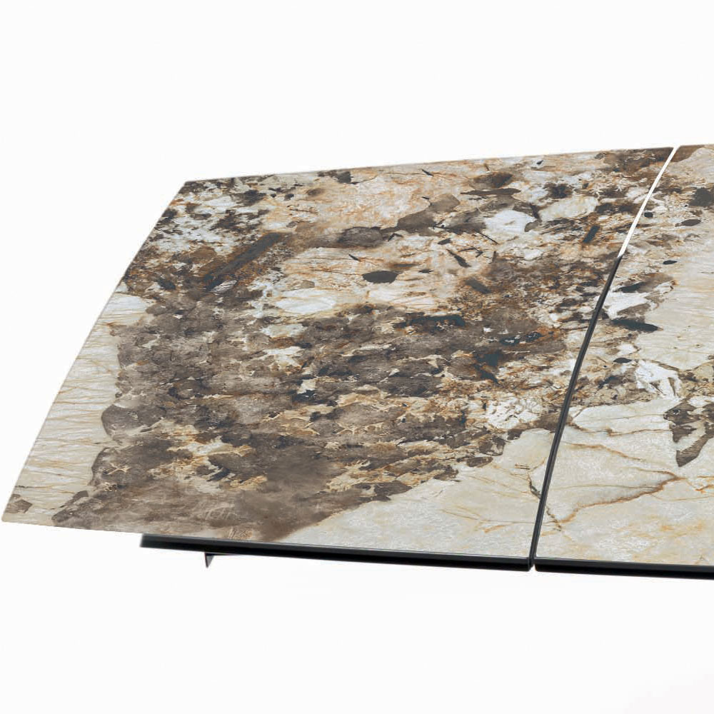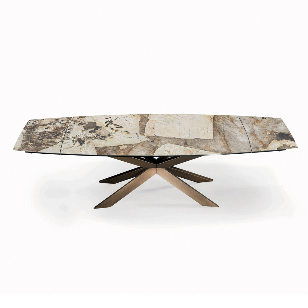 Extendable barrel-shaped living room table with integrated extensions, ceramic top with polished deset soul finish , straight edge,