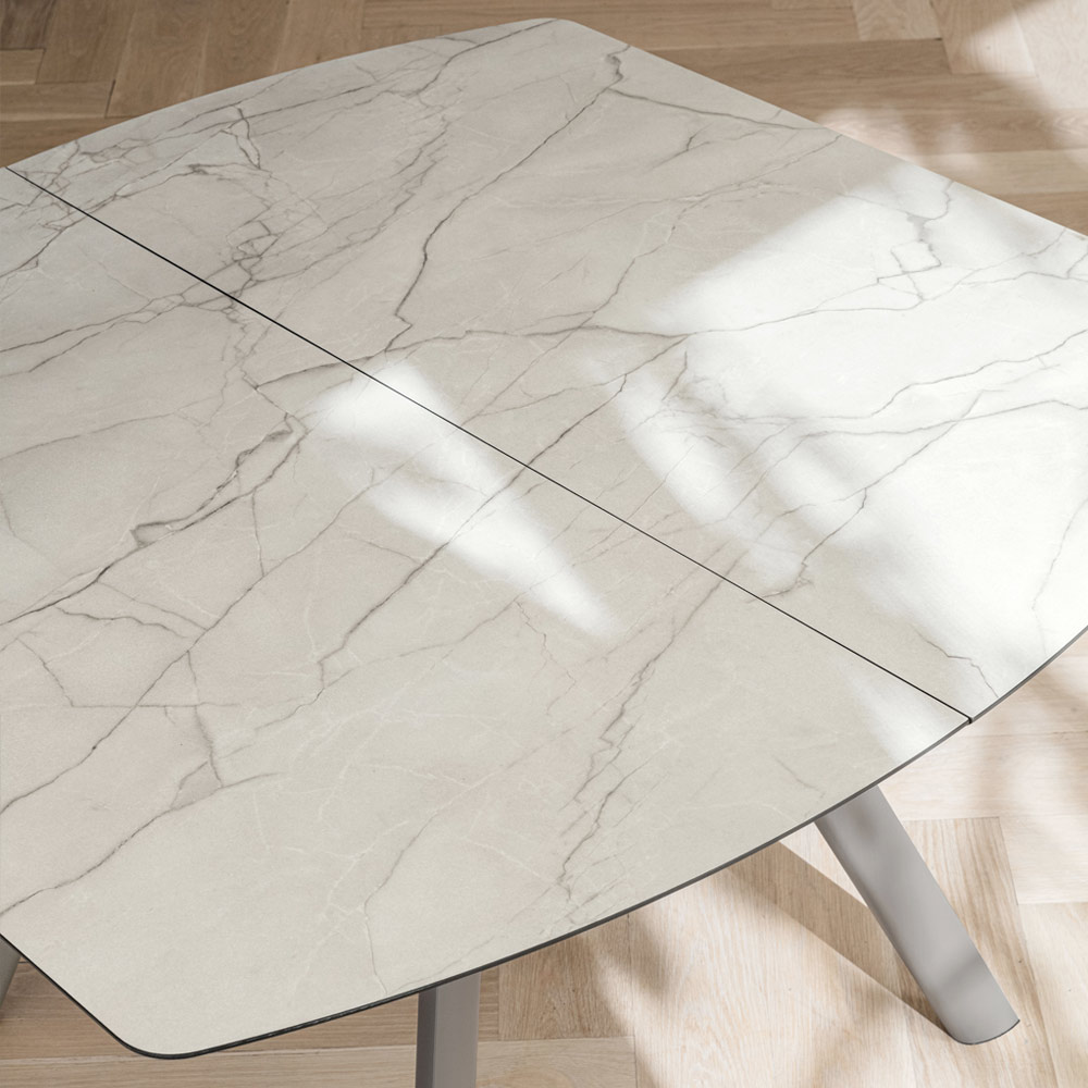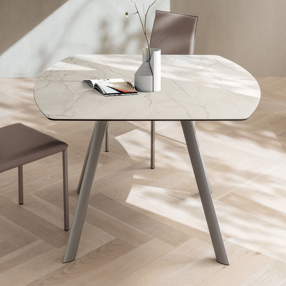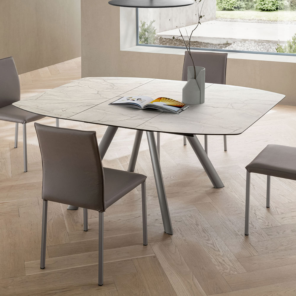 The HPL top adds brightness and refinement to the environment, recalling the veins of the stone with a resistant surface. Thanks to the central extension system , the table extends easily, offering additional space for guests or family lunches, maintaining a harmonious line even when open.