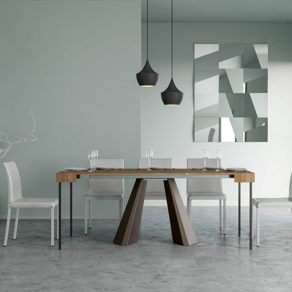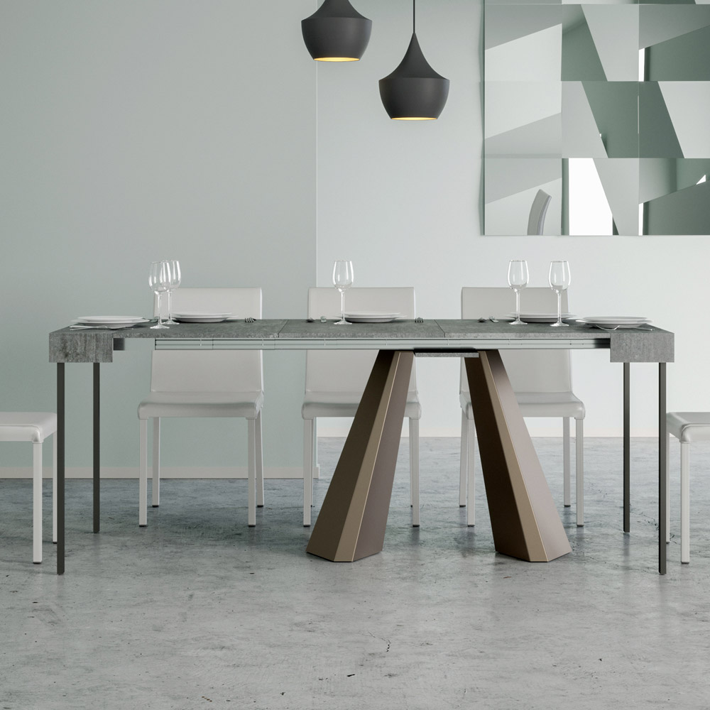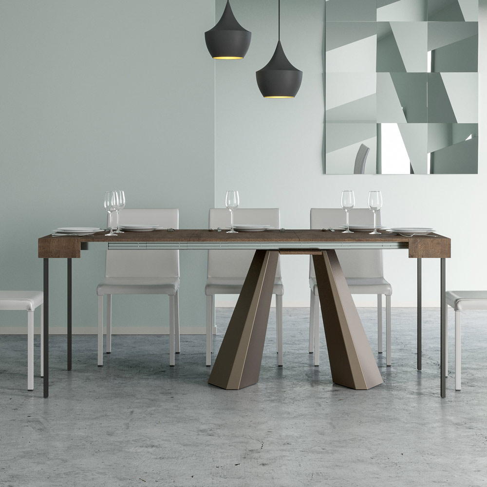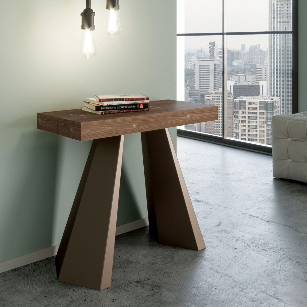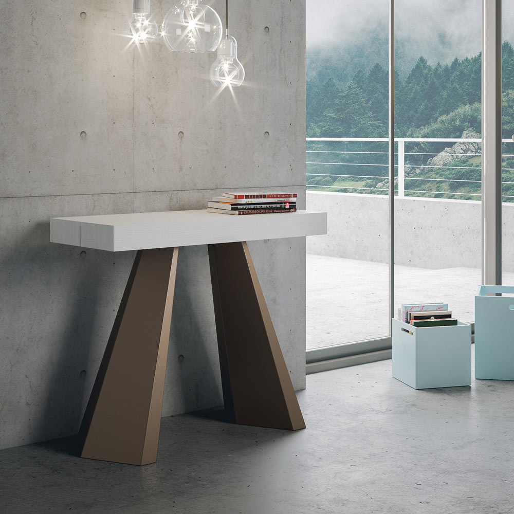 The uniqueness of this console table lies in its legs, which are reminiscent of the geometric shapes of modern architecture, offering a scultural and avant-garde appearance. Thanks to its extendable system, this piece transforms any space from simple to extraordinary, extending to accommodate social times or to provide that extra surface area you need.