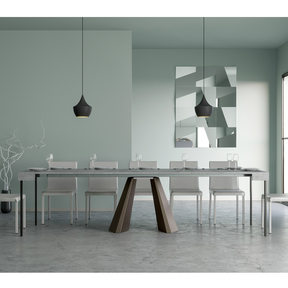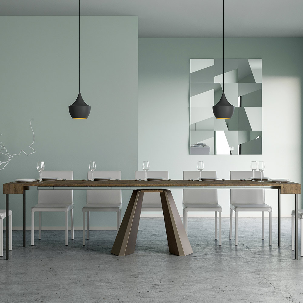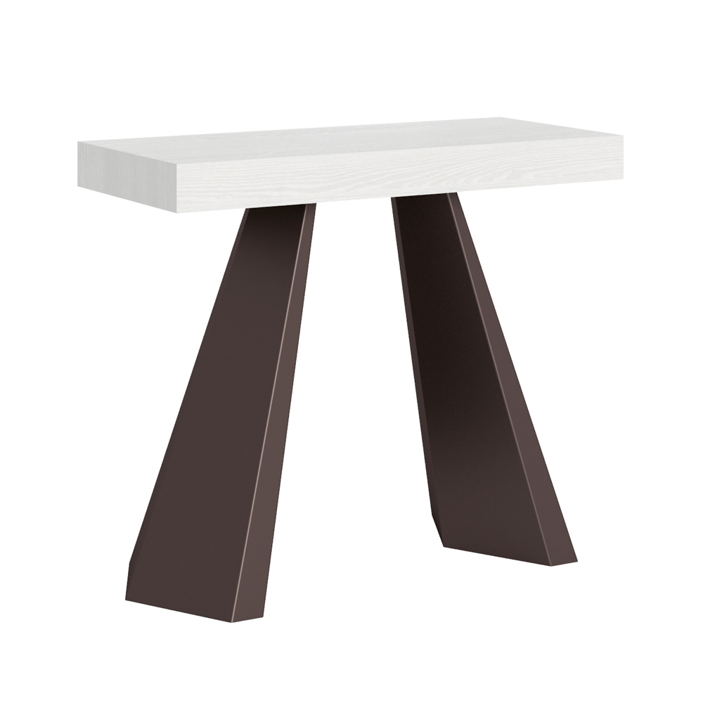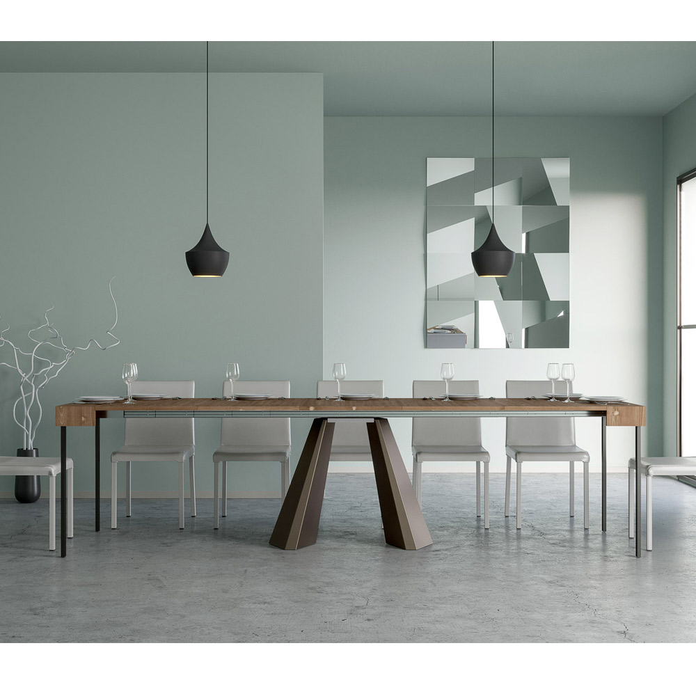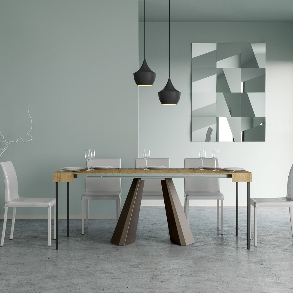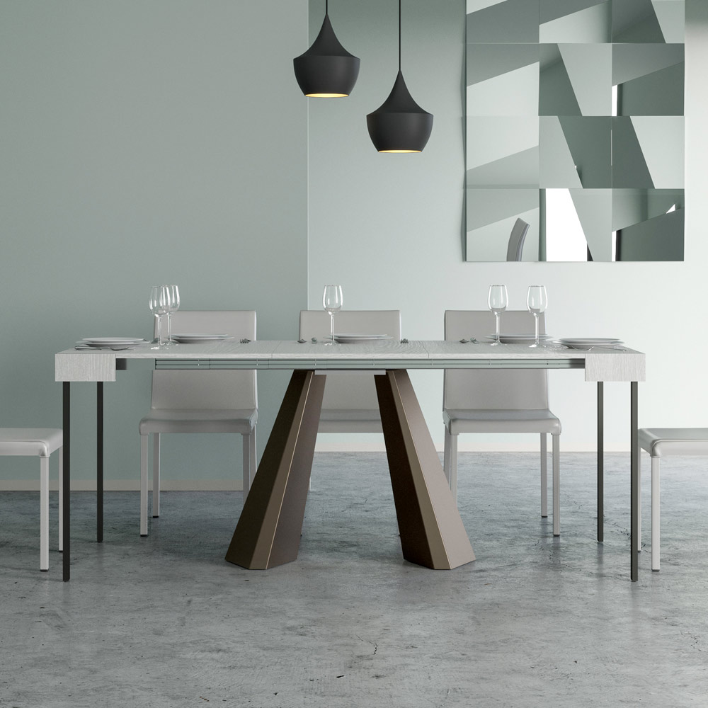 The uniqueness of this console table lies in its legs, which are reminiscent of the geometric shapes of modern architecture, offering a scultural and avant-garde appearance. Thanks to its extendable system, this piece transforms any space from simple to extraordinary, extending to accommodate social times or to provide that extra surface area you need.