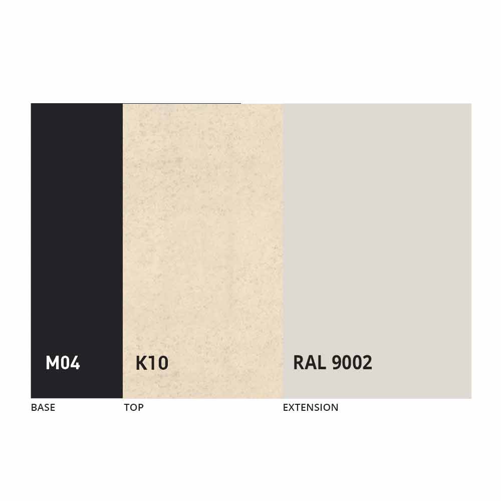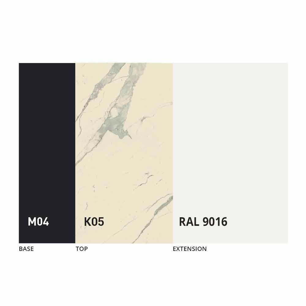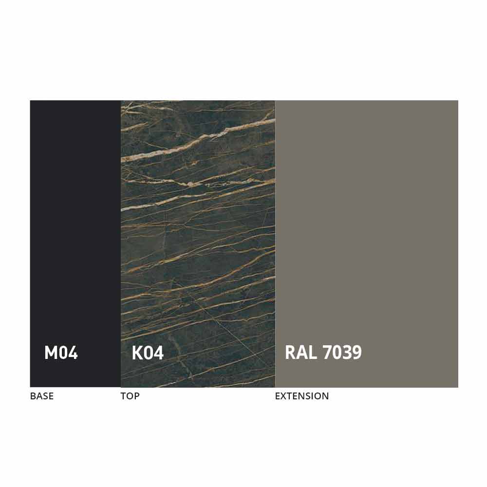 The top and base of the table can be customized with different materials and sample finishes or RAL lacquering. For information, contact us using the appropriate " Request Information" form.