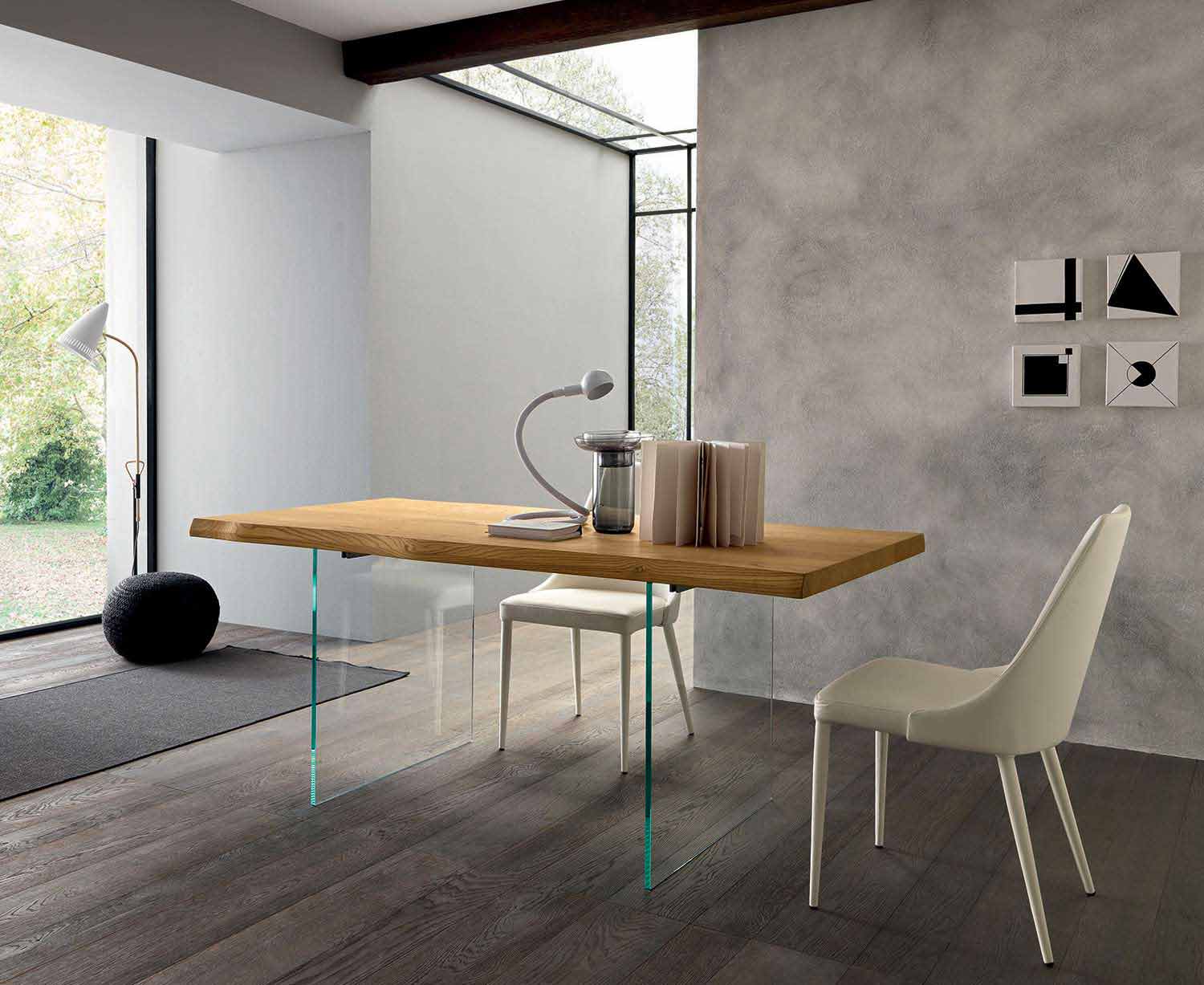 Its peculiar feature consists in the transparent glass legs , which seem to make the wooden top float with a strong natural reference and high thickness (5 cm).