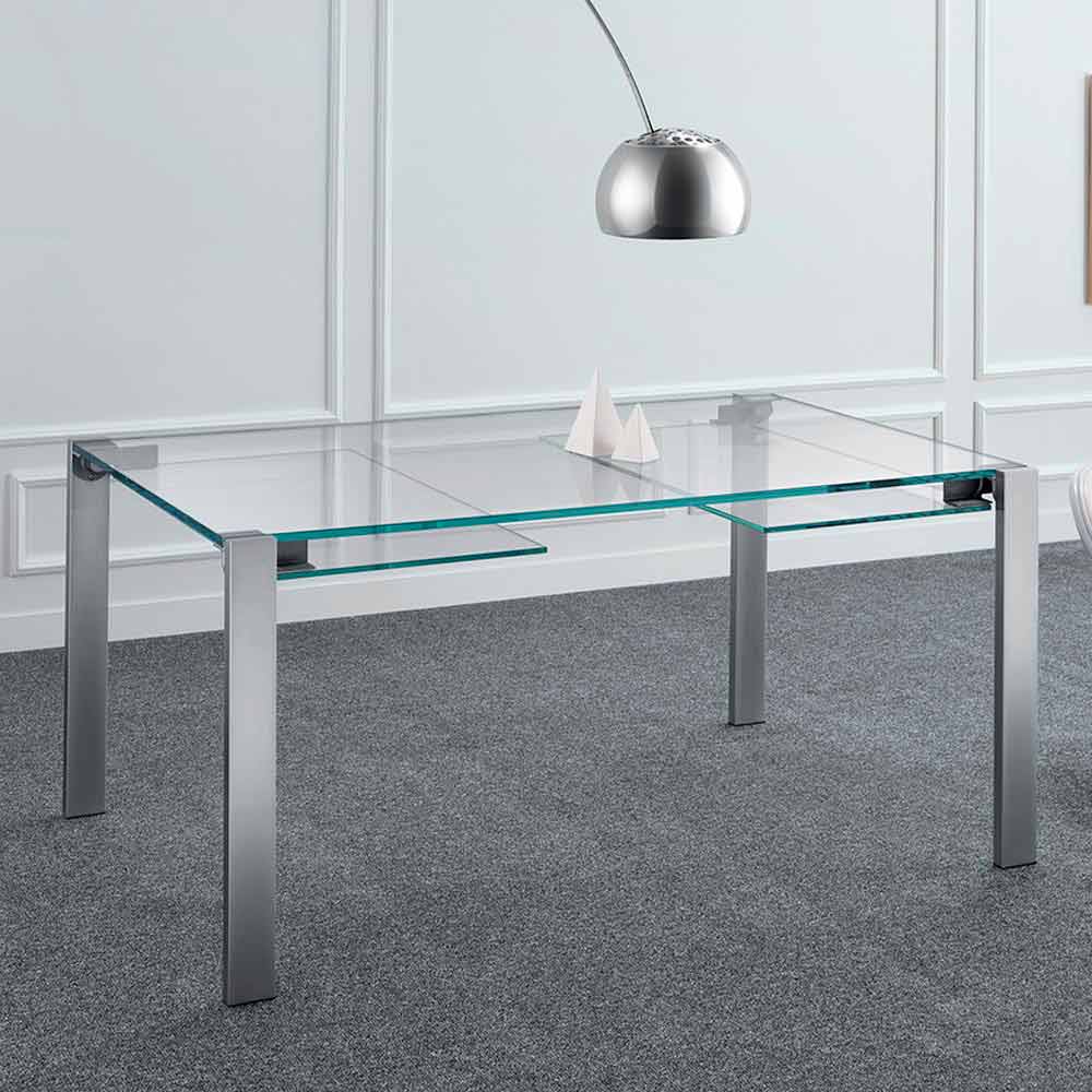 - top and extensions in extra-clear glass and legs in matt chromed metal;
