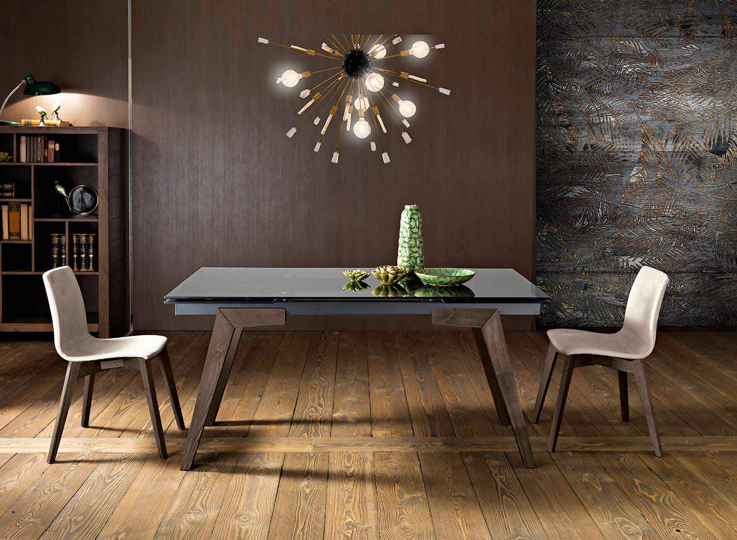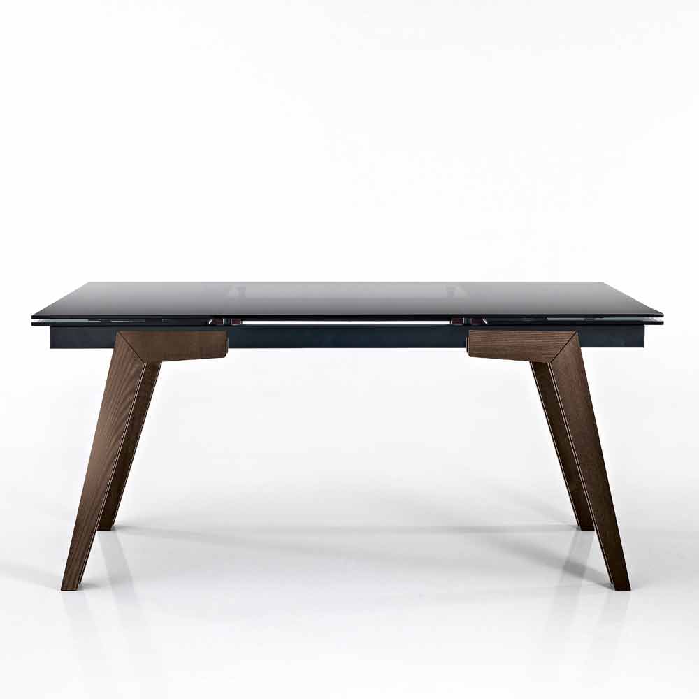 Dimitri is an elegant extendable table made in Italy with a fumè tempered glass surface (thickness 10mm) and oak solid wood legs available in two different finishes: