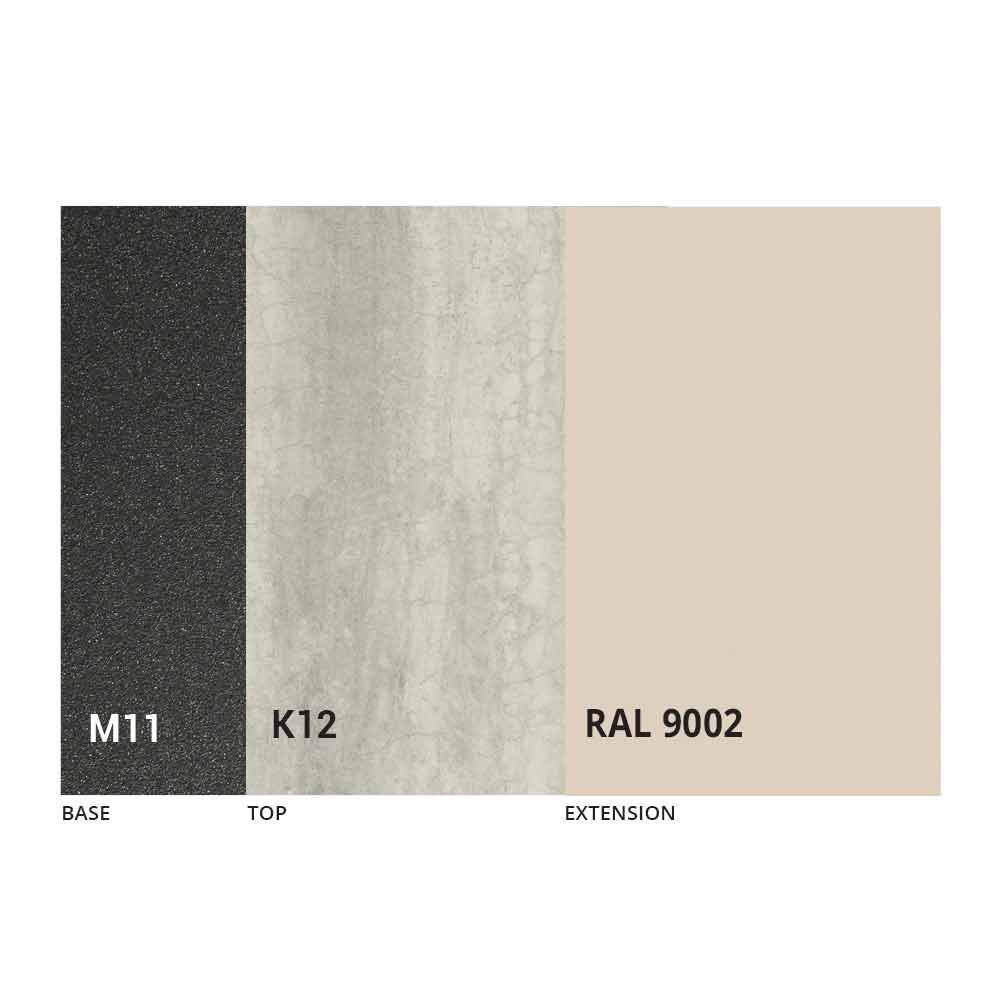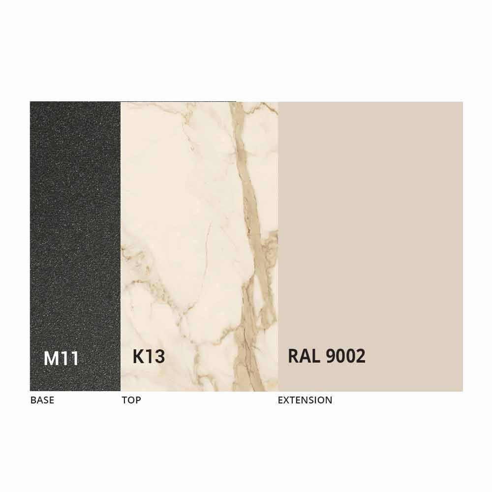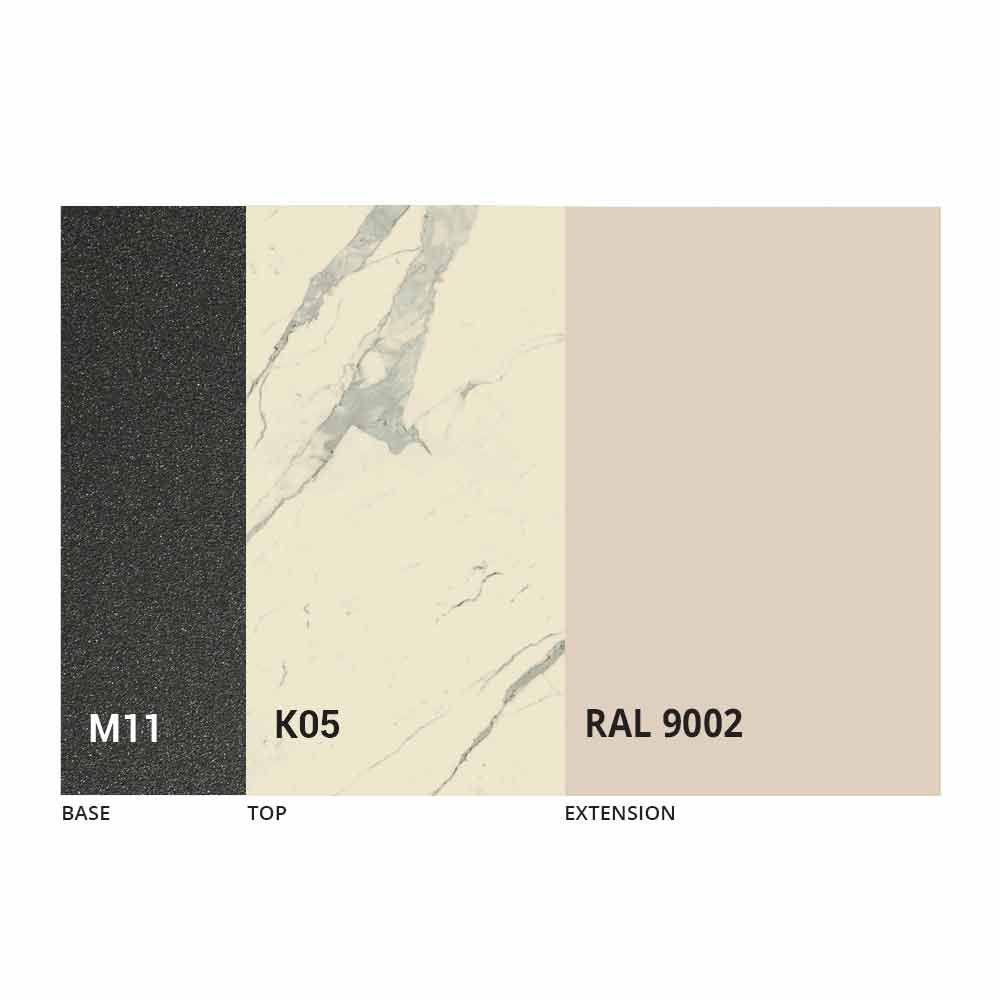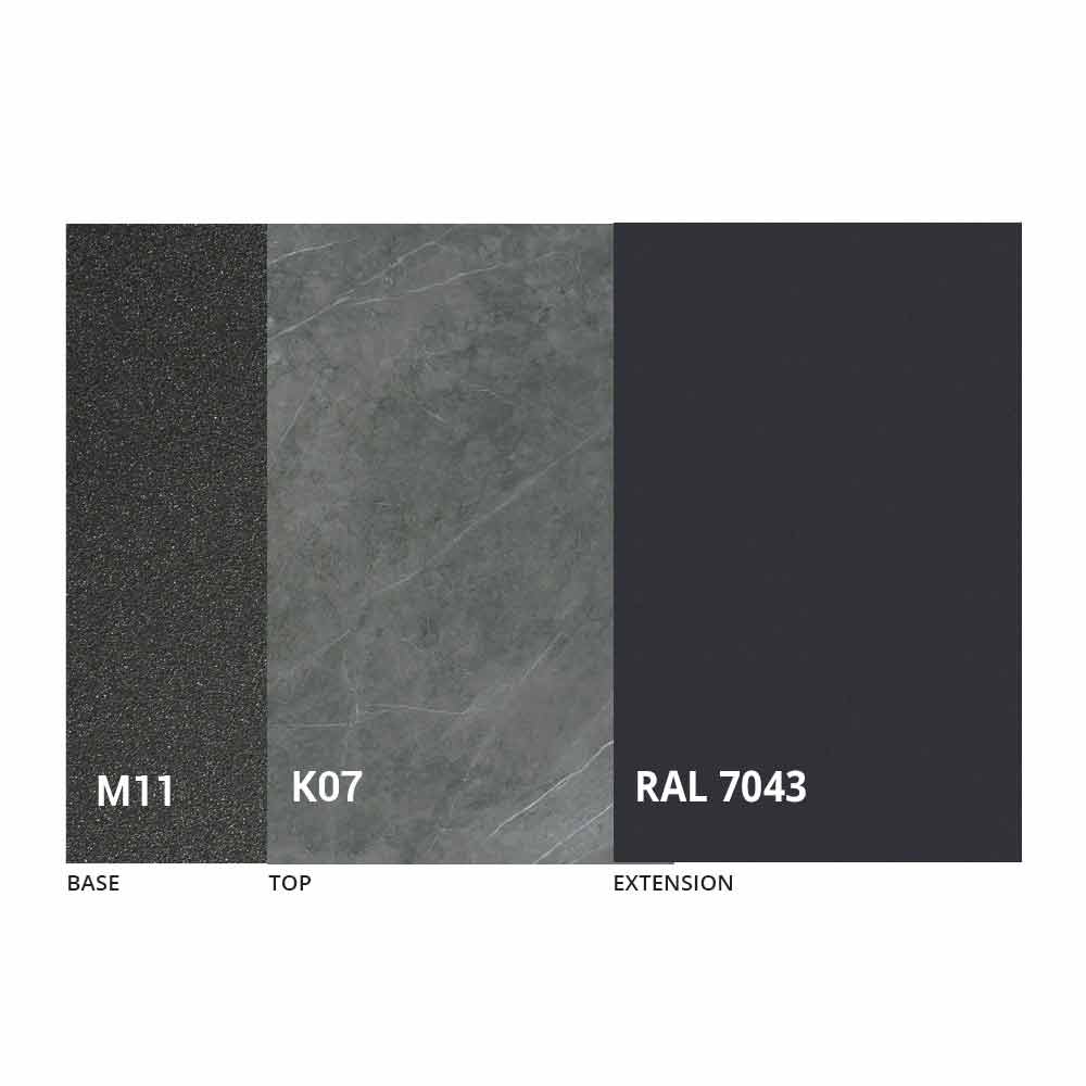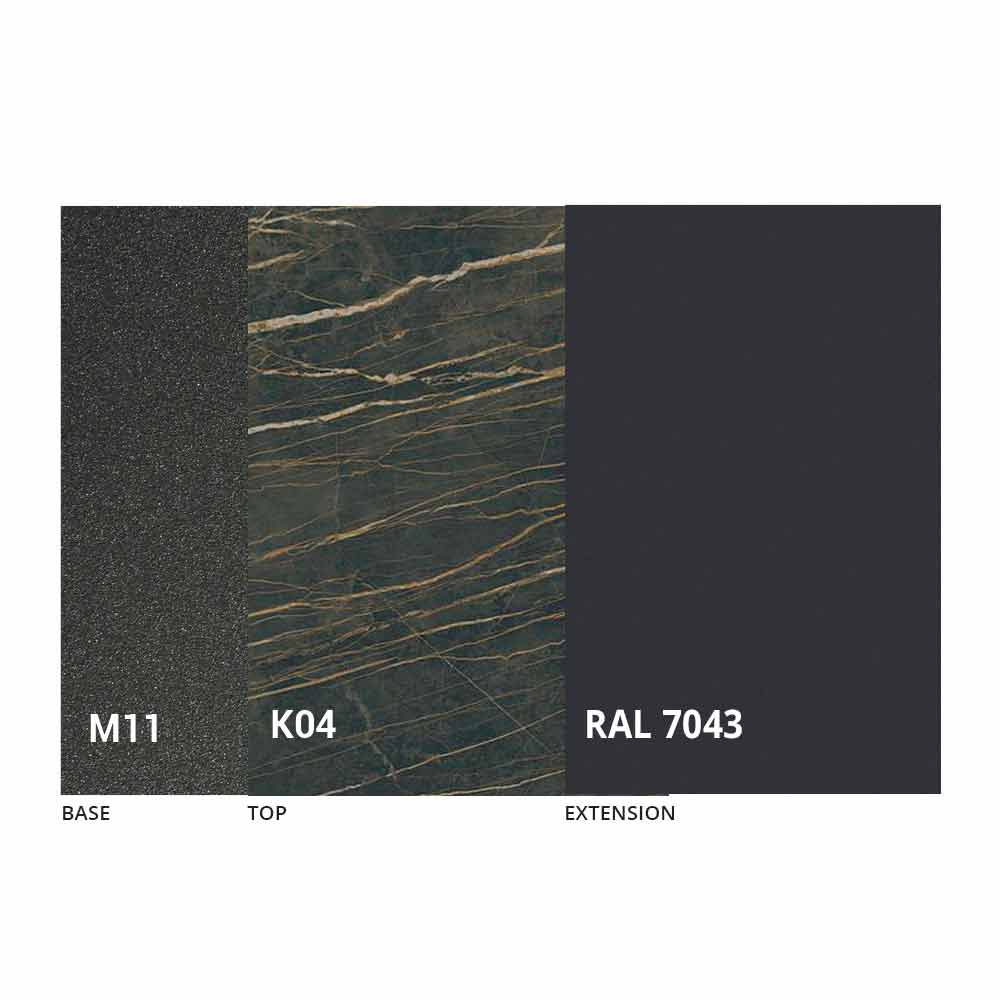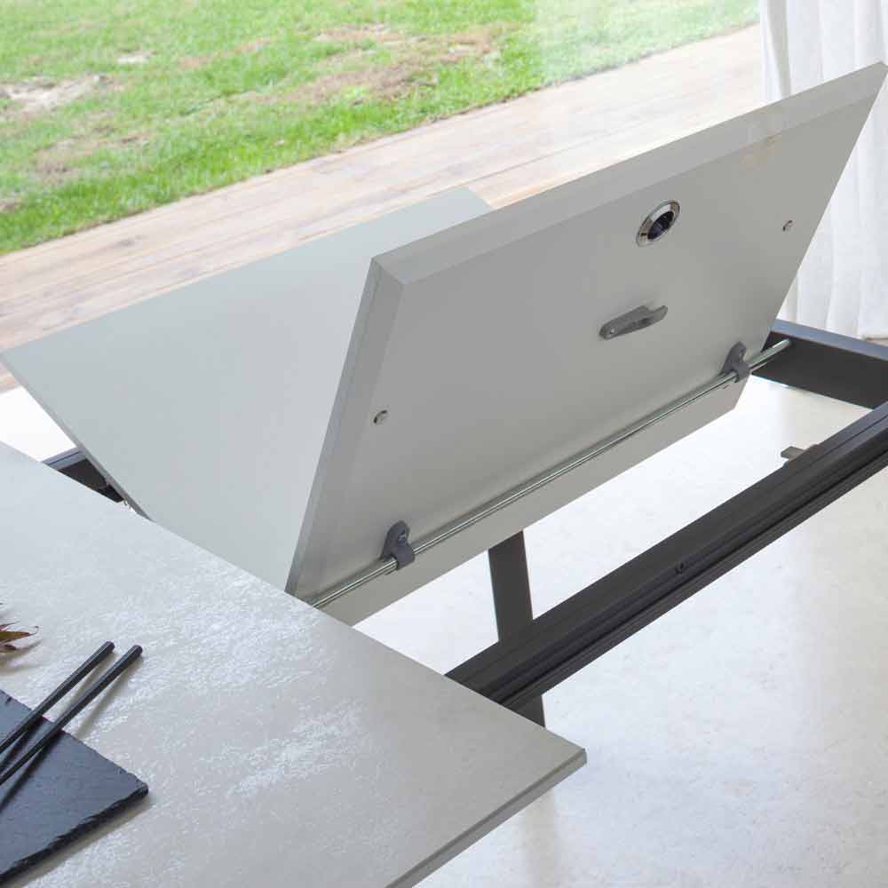 Characterized by a laminam ceramic top on a melamine panel and embossed graphite painted metal base, the top can be extended thanks to a telescopic mechanism with an internal folding extension in the same color as the underlying panel.