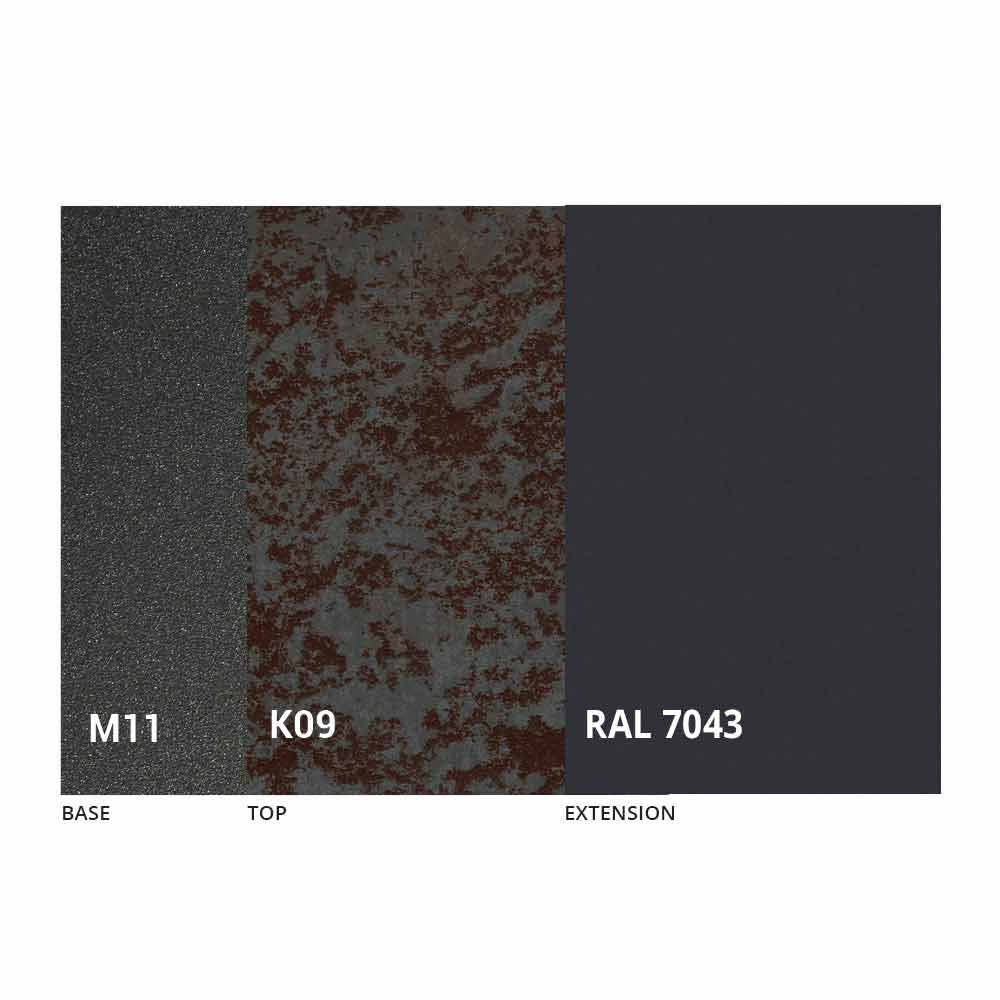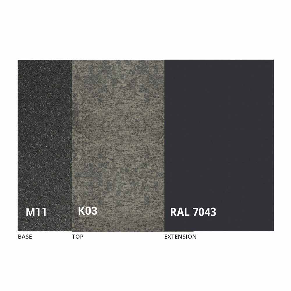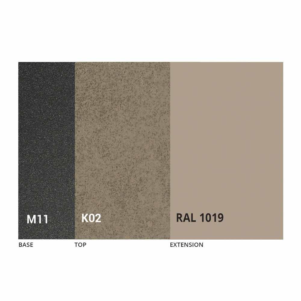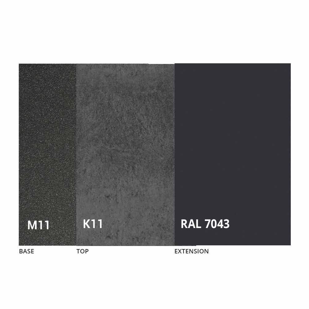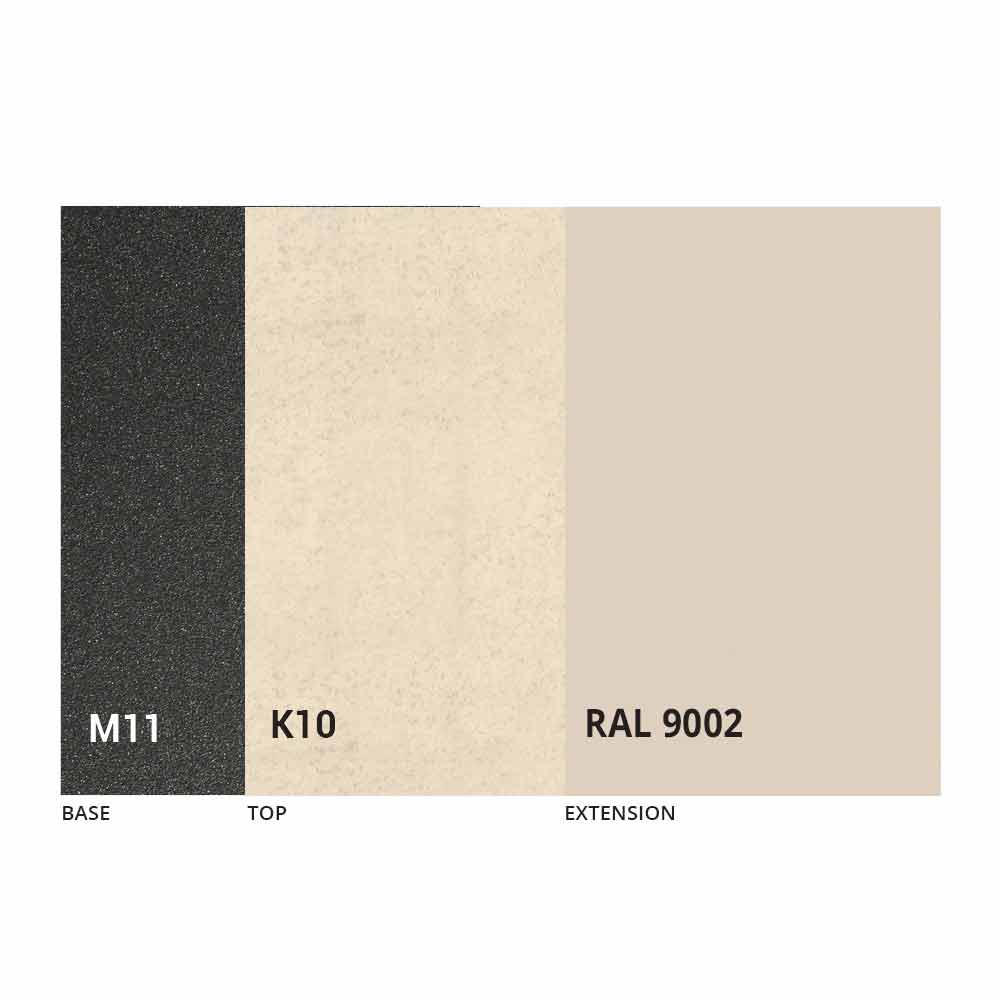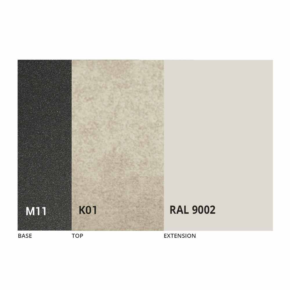 Characterized by a laminam ceramic top on a melamine panel and embossed graphite painted metal base, the top can be extended thanks to a telescopic mechanism with an internal folding extension in the same color as the underlying panel.