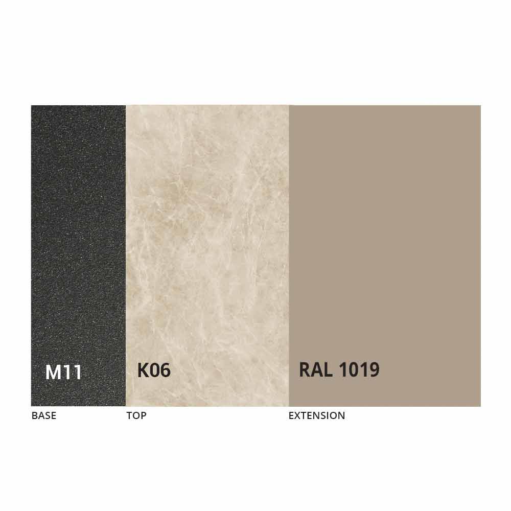 The top and base of the table can be customized with different materials and sample finishes or RAL lacquering. For information, contact us using the appropriate " Request Information" form.