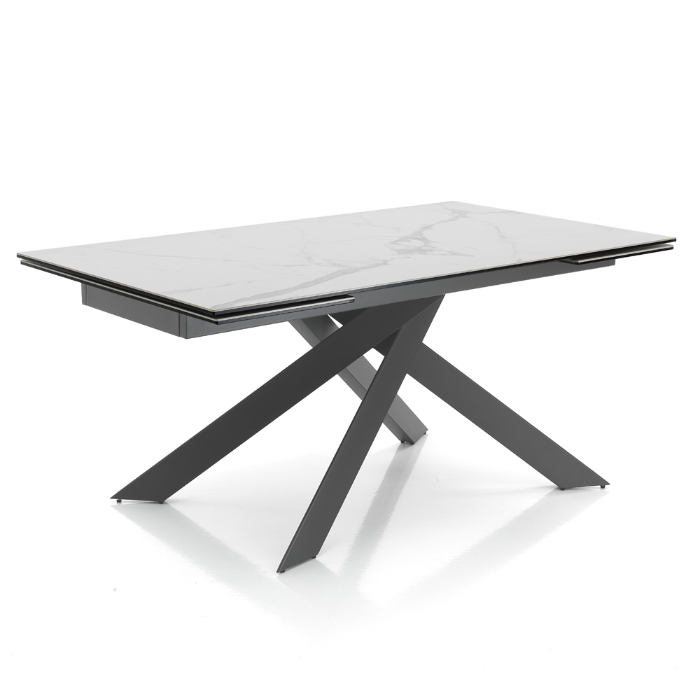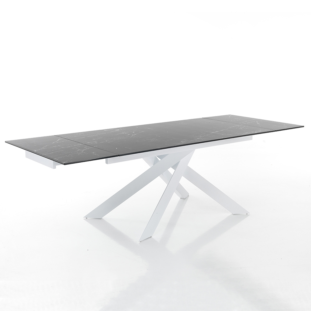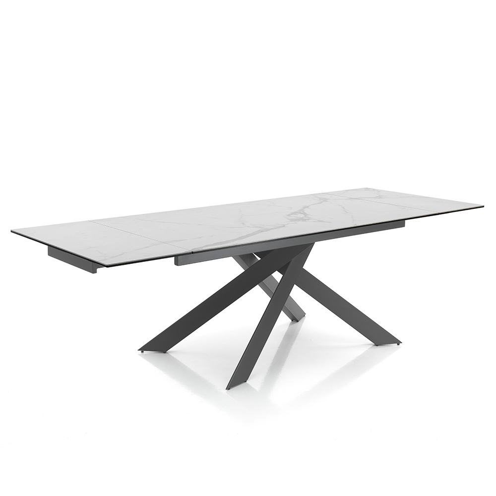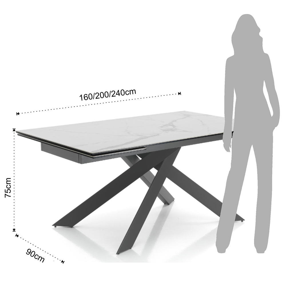 painted steel structure. Thanks to the two extensions of 40 cm each positioned under the top, the table can reach a maximum length of 240 cm, thus allowing it to accommodate a greater number of guests for wonderful lunches and dinners in company. The perfect combination of the elegance of the ceramic and the imposing detail of the steel base creates a furnishing accessory with a