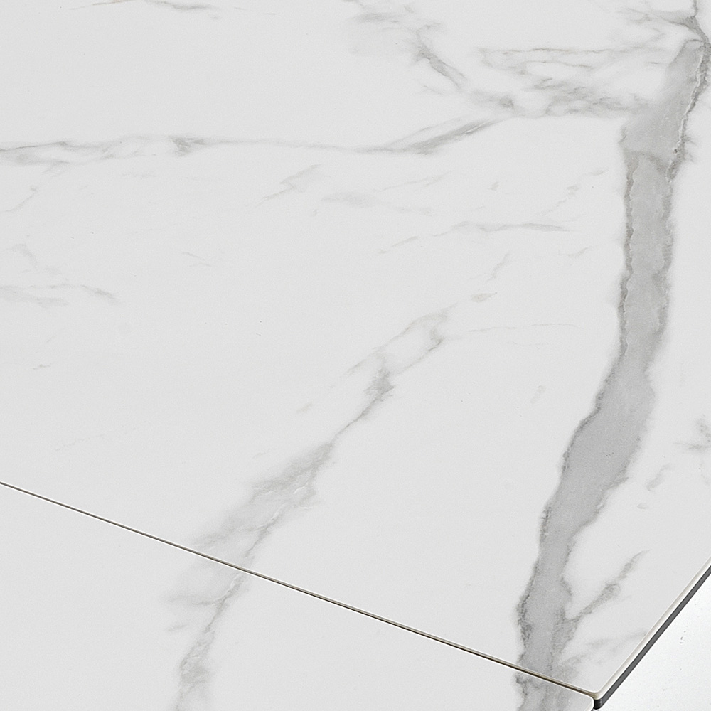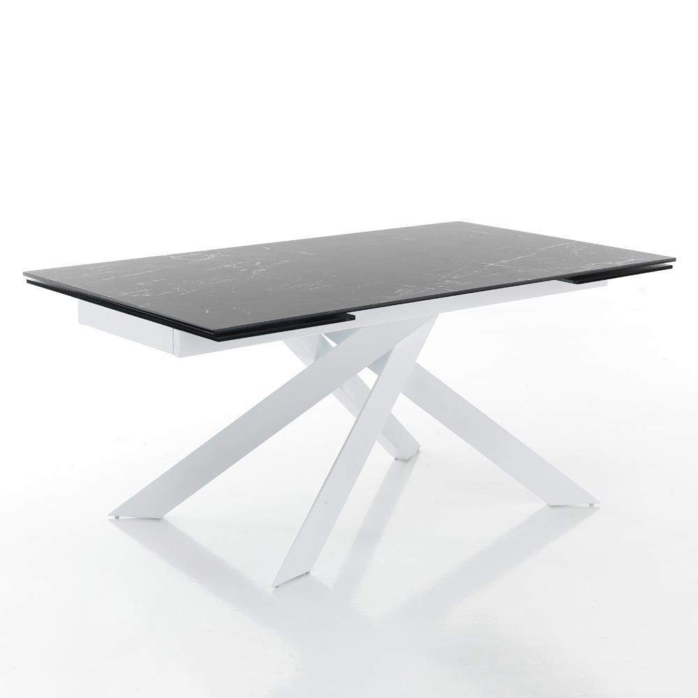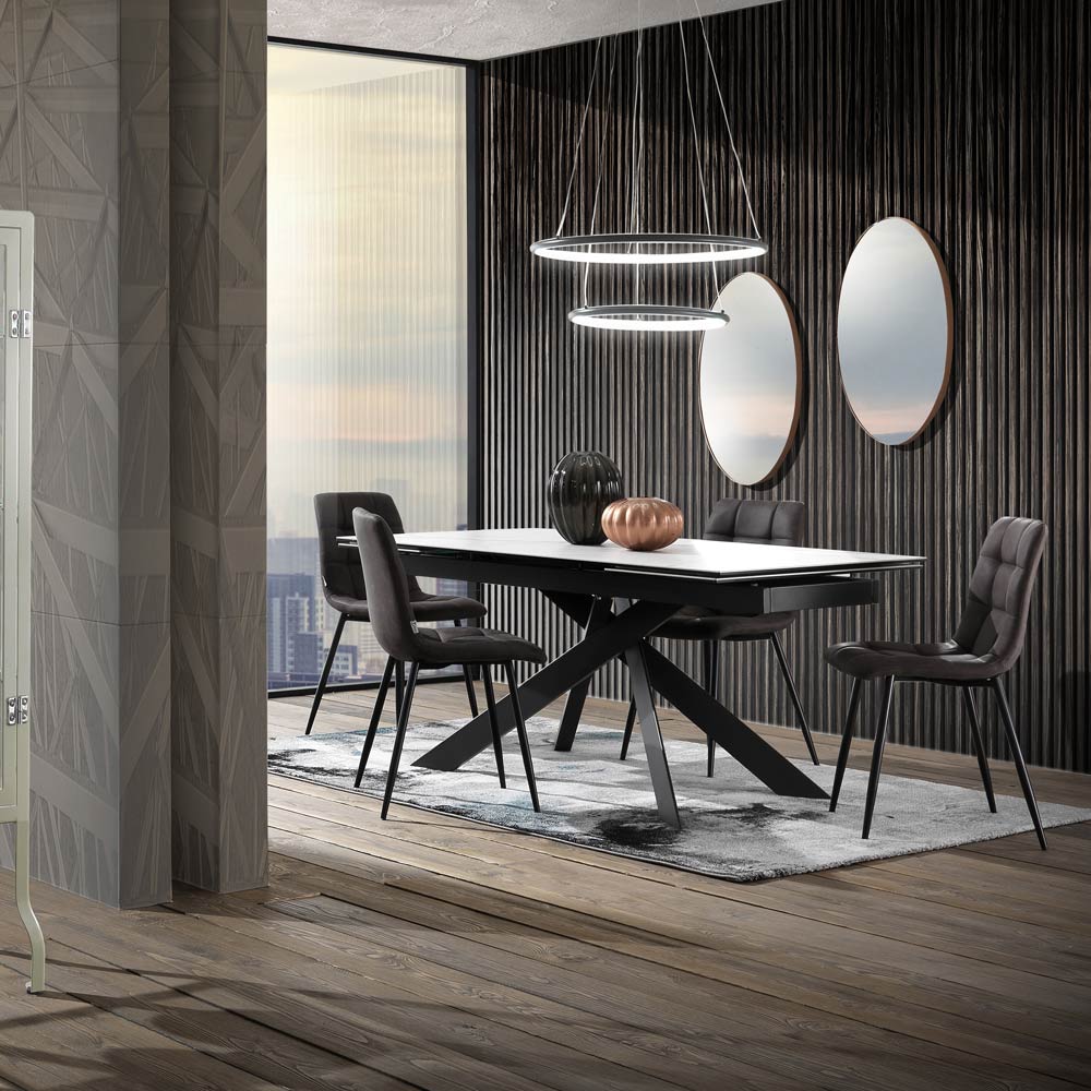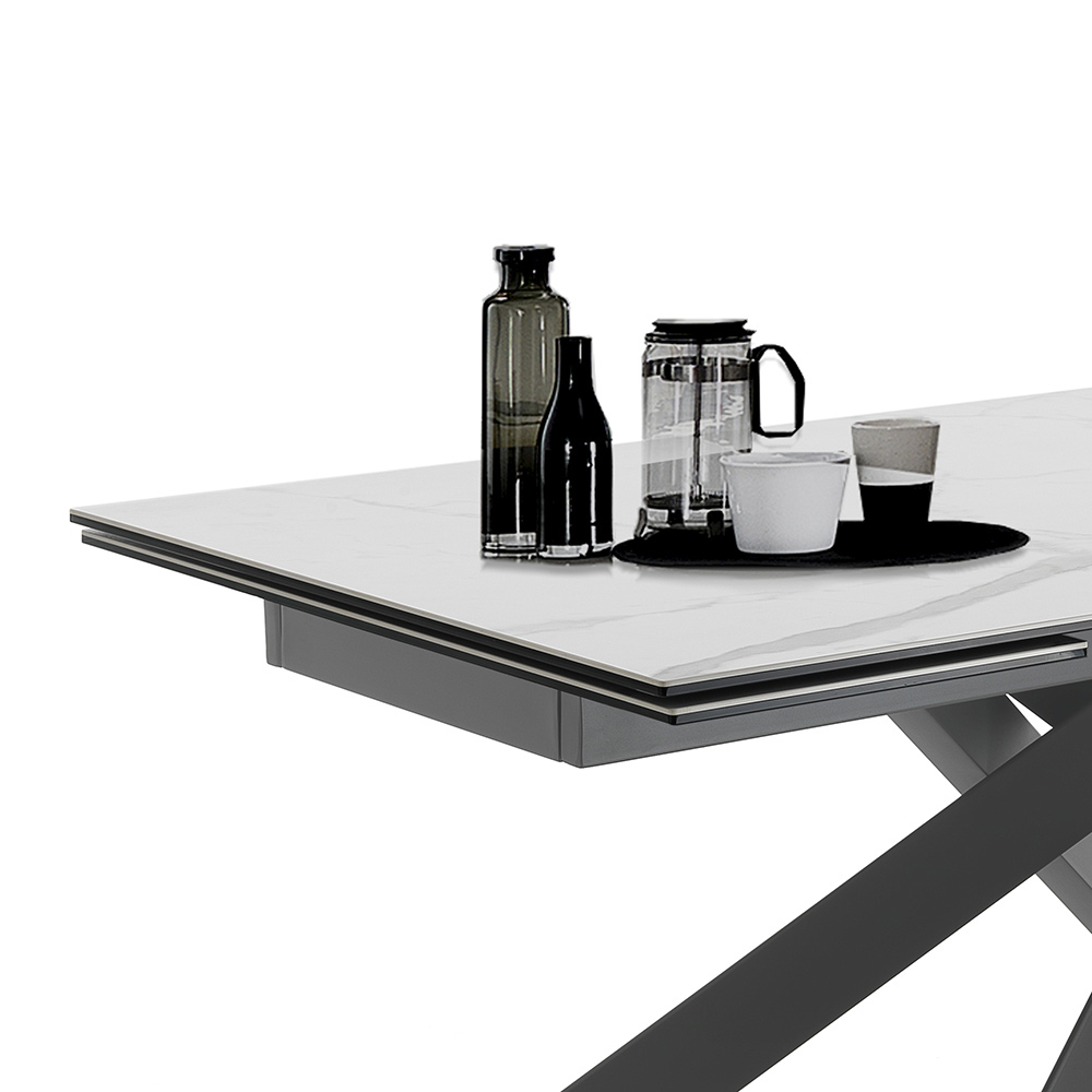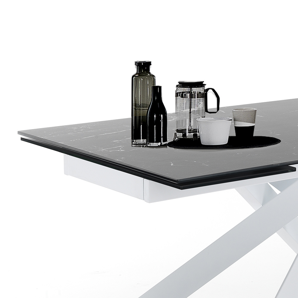 painted steel structure. Thanks to the two extensions of 40 cm each positioned under the top, the table can reach a maximum length of 240 cm, thus allowing it to accommodate a greater number of guests for wonderful lunches and dinners in company. The perfect combination of the elegance of the ceramic and the imposing detail of the steel base creates a furnishing accessory with a