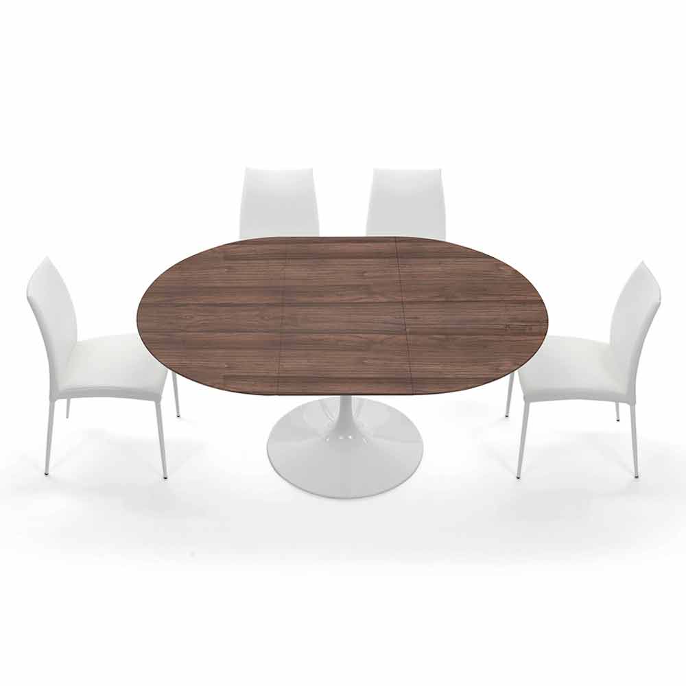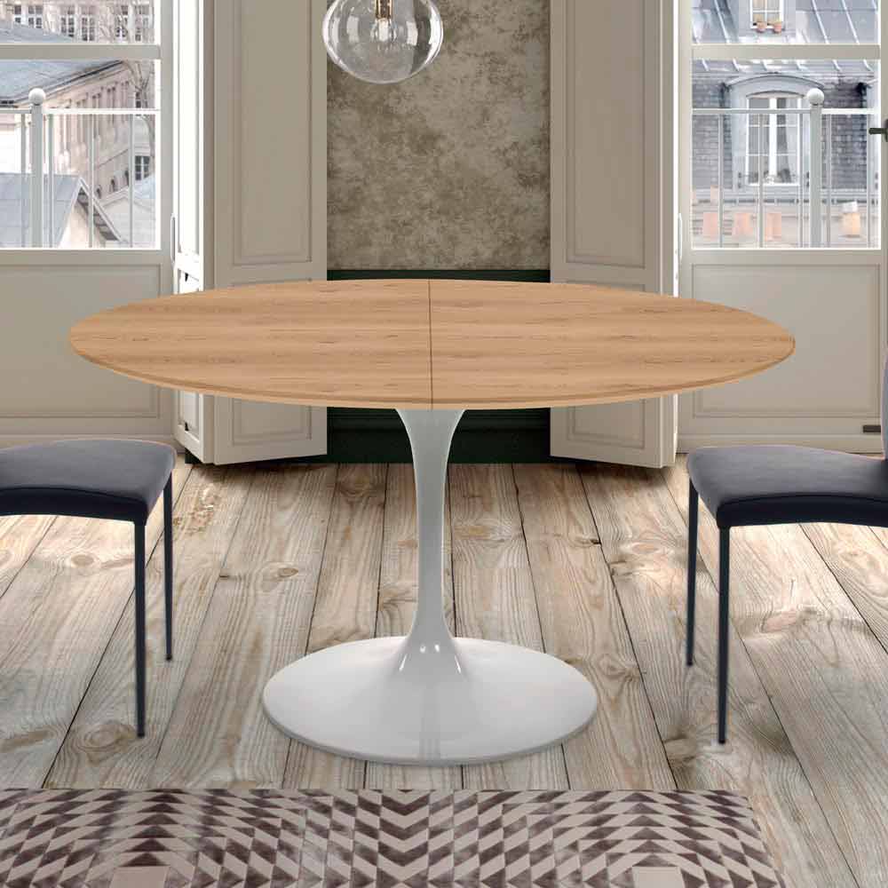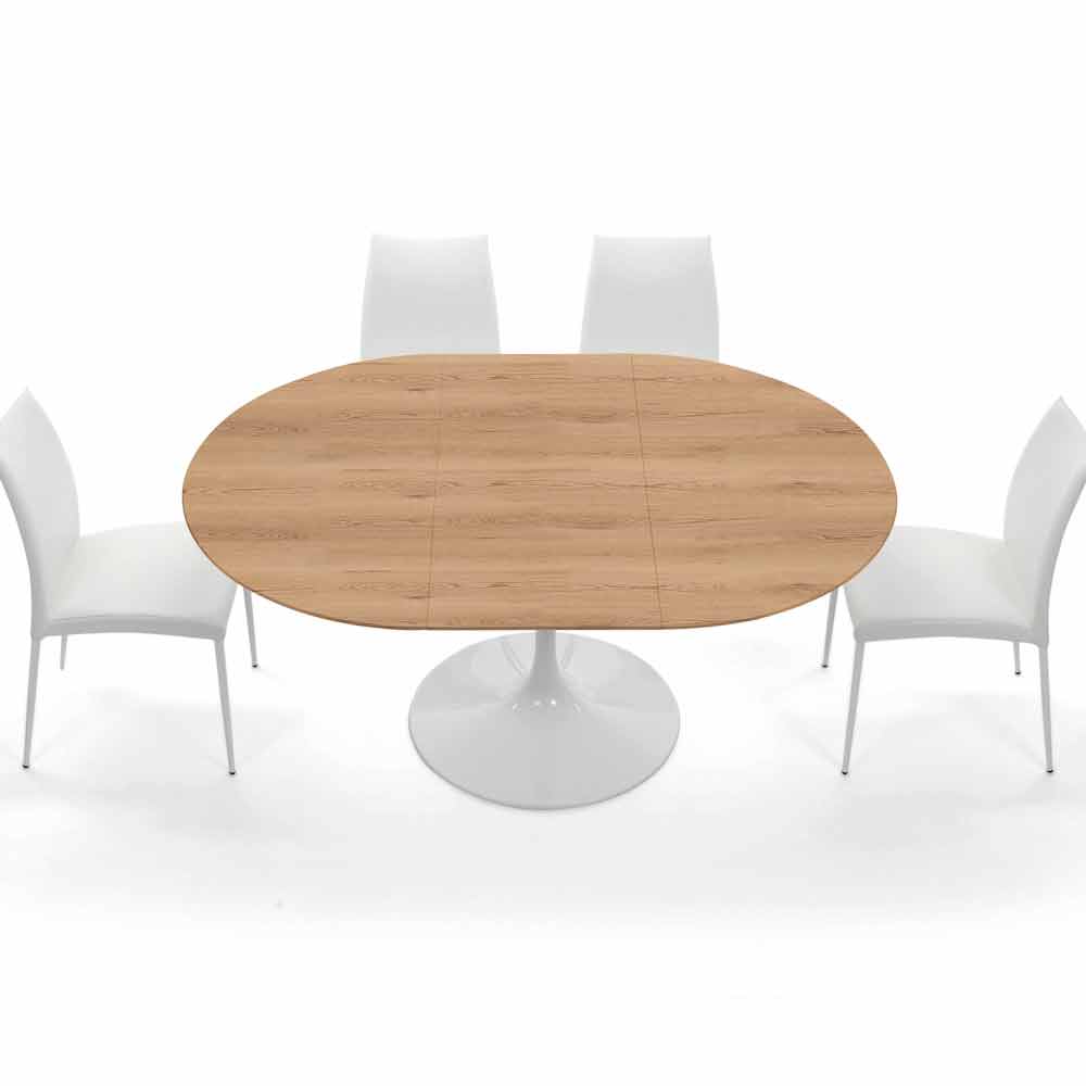 Elegant dining table made in Italy with round extendable top in HPL laminate and base in glossy white lacquered cast aluminium . An exclusive and cutting-edge design characterizes this furnishing accessory with an elegant and refined soul capable of furnishing any environment with a modern taste with personality. Together with the captivating and refined aesthetics, the functional side given by the extendable top is underlined which, thanks to an external 50 cm extension, offers the possibility of accommodating up to 8 people, occupying a smaller space once closed. The touch that characterizes the table, making it unique and giving it a refined design , is the hpl top, a high pressure laminate extremely resistant to chemical agents, abrasions and scratches which ensures a solid support surface with excellent durability over time .