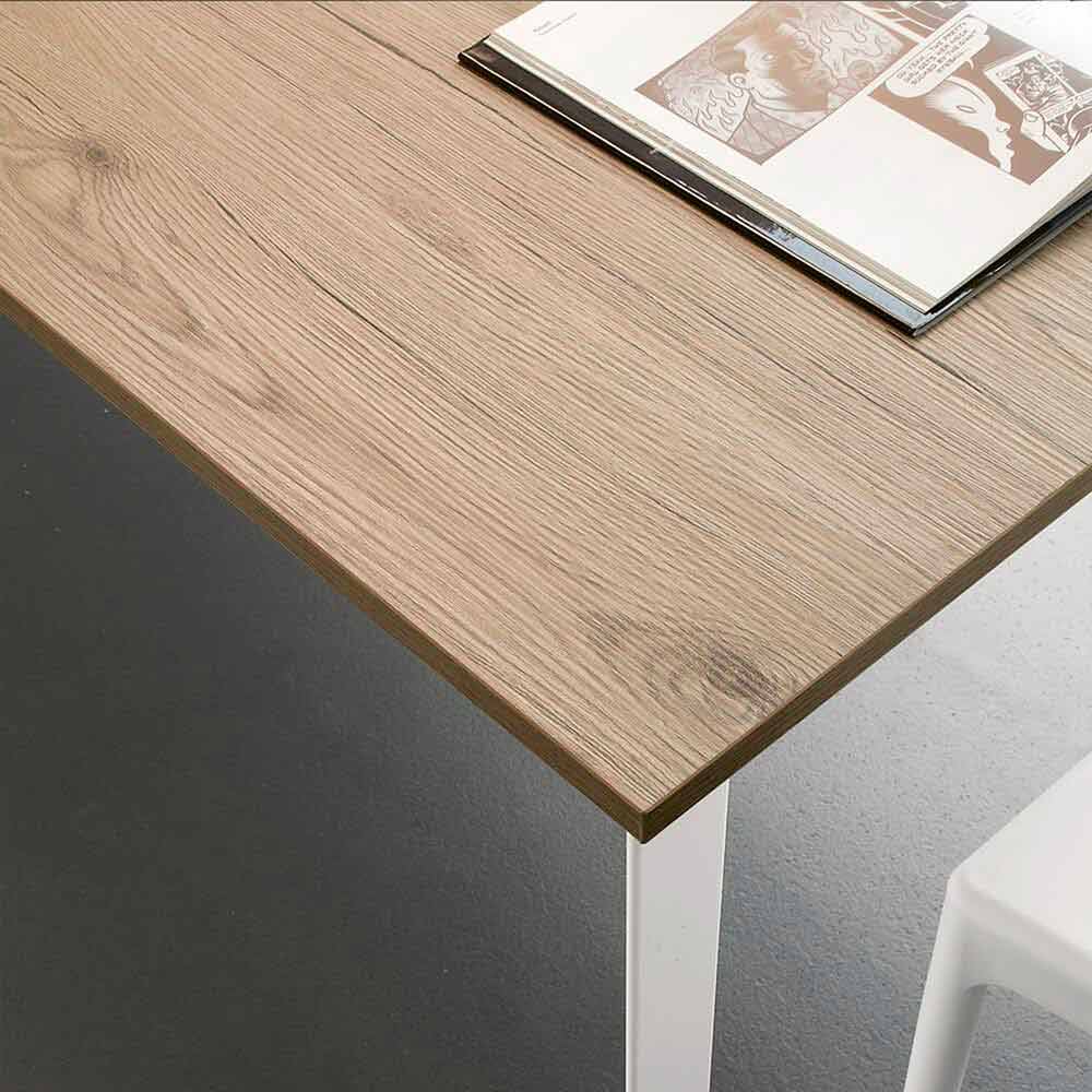 Dining table made in Italy with melamine top (thickness 20mm) with bark finish, extension in melamine matching the top and base in white painted metal .