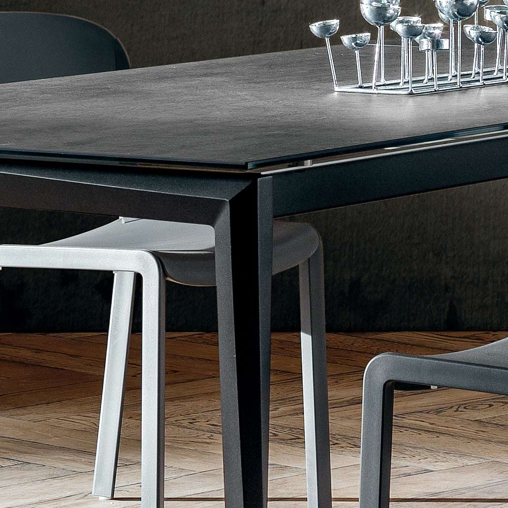 Dining table made in Italy with legs in beech wood painted in anthracite finish, top in laminam (porcelain stoneware) from   3 mm supported by a glass plate   and guide in painted aluminum with runners in acetal resin (POM). A simple and captivating design thanks to the particular texture of the top that gives the aesthetics of the table a refined and elegant soul , making it an ideal furnishing idea for those who love a classy style that can enrich and complete the look of their own at the same time. dining room or kitchen.