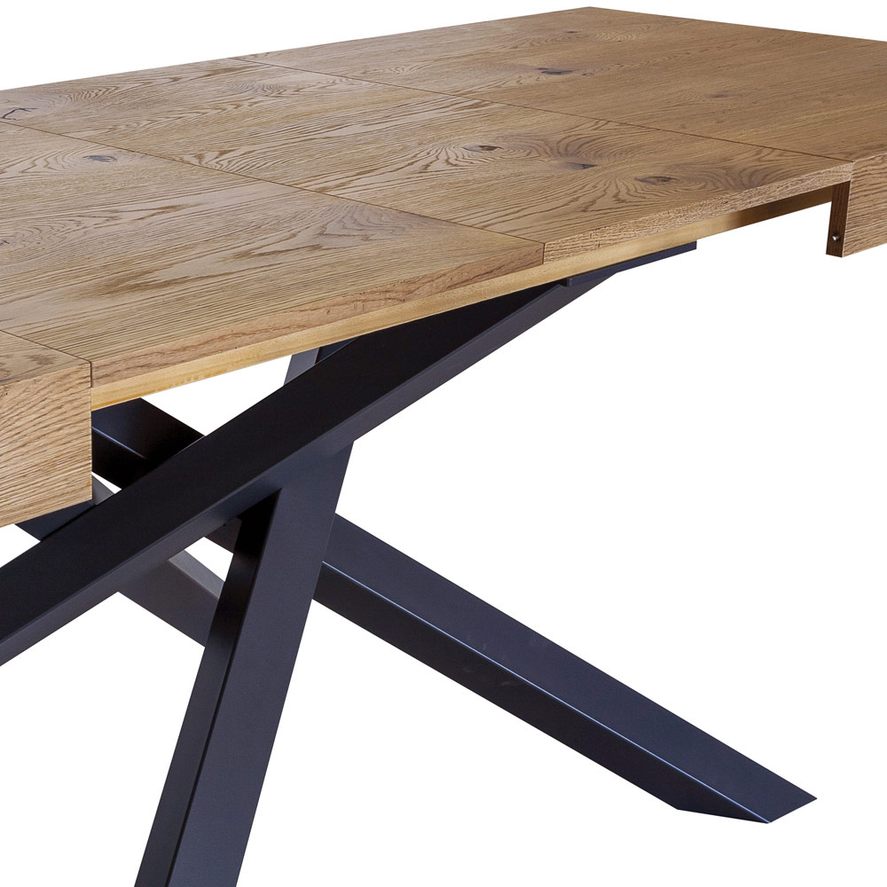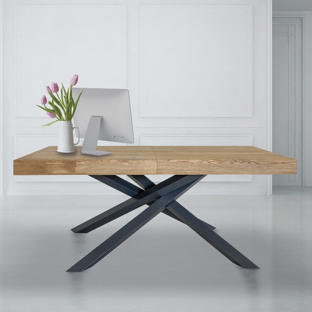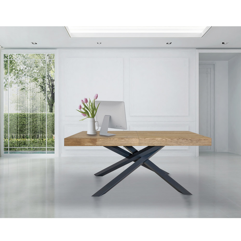 Extendable living table in solid wood. The base is in metal only in the finish black color. The product is entirely made in Tuscany with the use of high quality materials and comes with 2 extensions of 50 cm each, housed inside the top, which make it versatile.