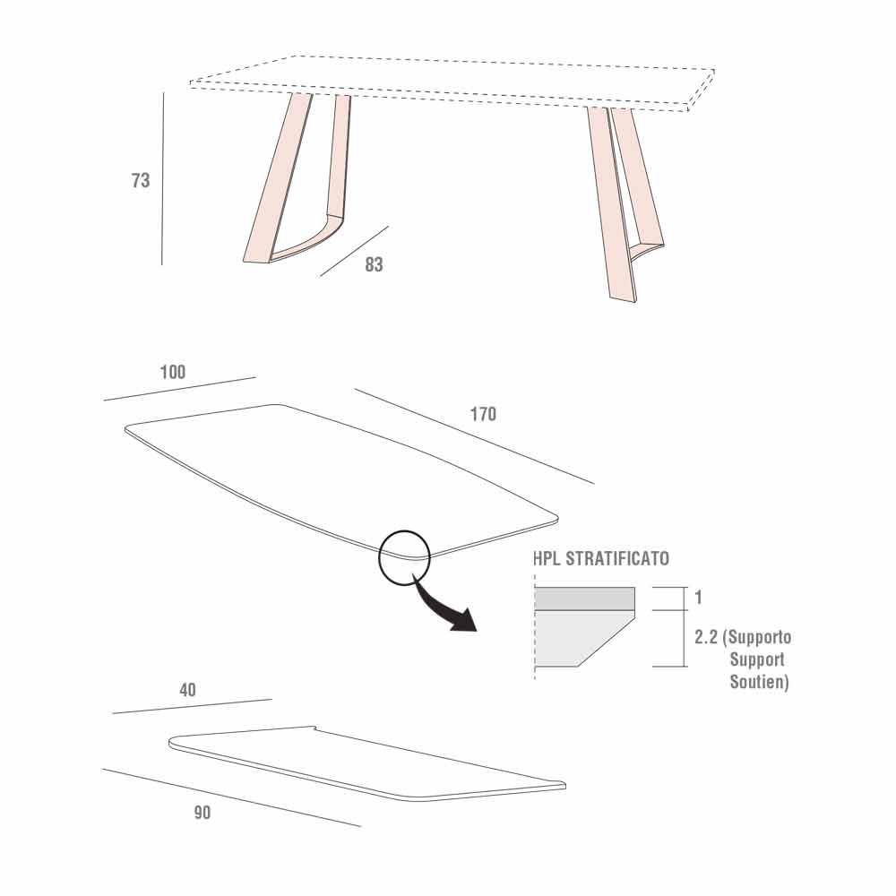 side extensions of 40 cm each, it will also be possible to extend the top up to a maximum length of 280 cm, thus creating a table capable of accommodating a greater number of guests, proving to be the ideal solution for those who like to organize lunches and dinners in company.