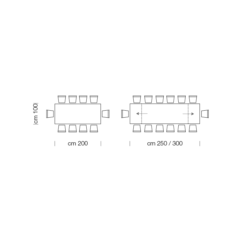 L 200 (300) x D 100 x H 76.5 cm 14 seats extendable with 2 external 50 cm extensions.