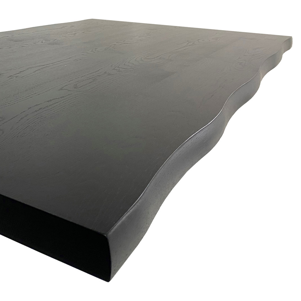 Characterized by a veneered wood top with irregular debarked edge and a black lacquered steel base.