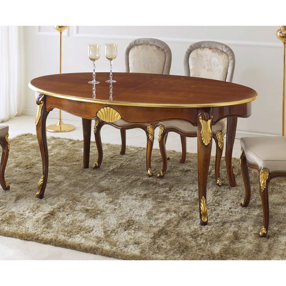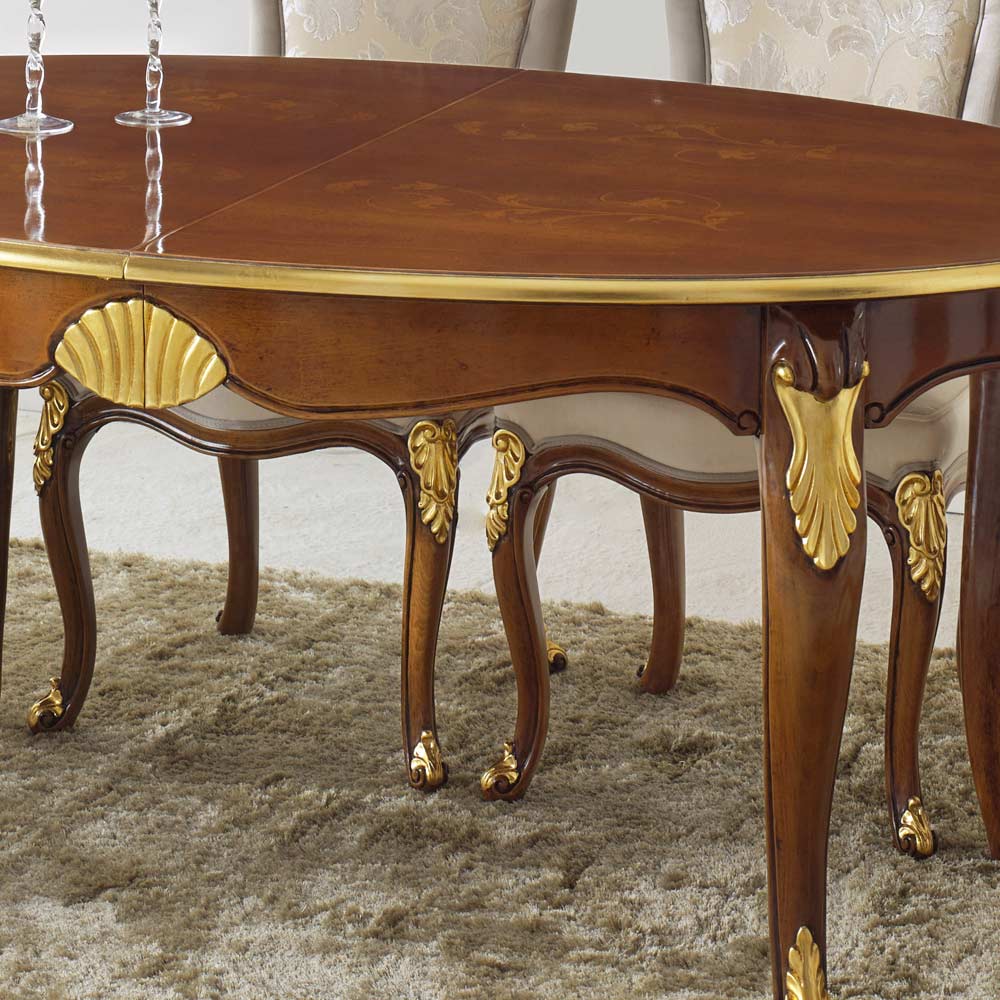 Oval dining table with extendable top thanks to two 50 cm internal extensions, made entirely of wood and available in Bassano walnut and antique gold or white and gold wood finishes. A unique and refined complement, completely