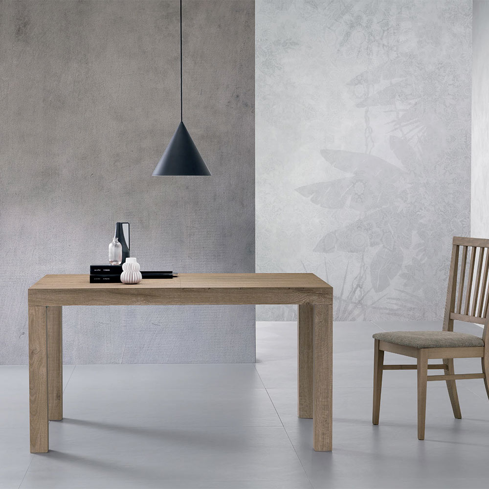 This table is a true example of minimalist design that doesn't sacrifice strength or functionality. Crafted from oak-finished laminate, which enhances the material's texture and warmth, this table stands out for its solid structure and the elegance of its pure, clean lines. The square shape and wide top create a welcoming and convivial atmosphere, perfect for furnishing your dining room with style.