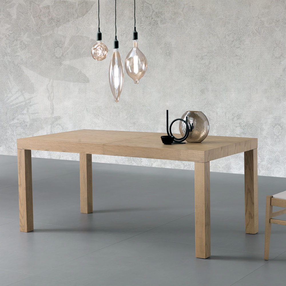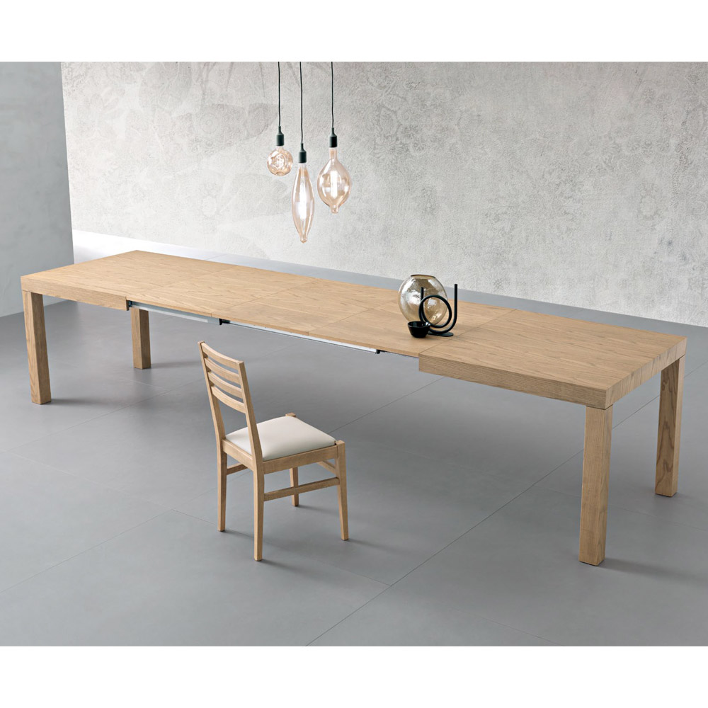 Extendable rectangular table with ash veneer top. 80 mm thick, folding finish.