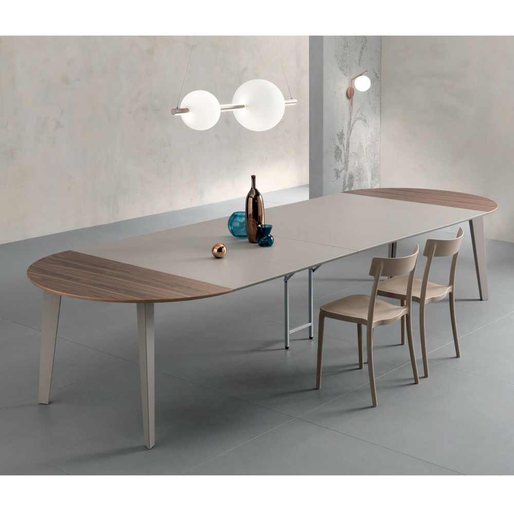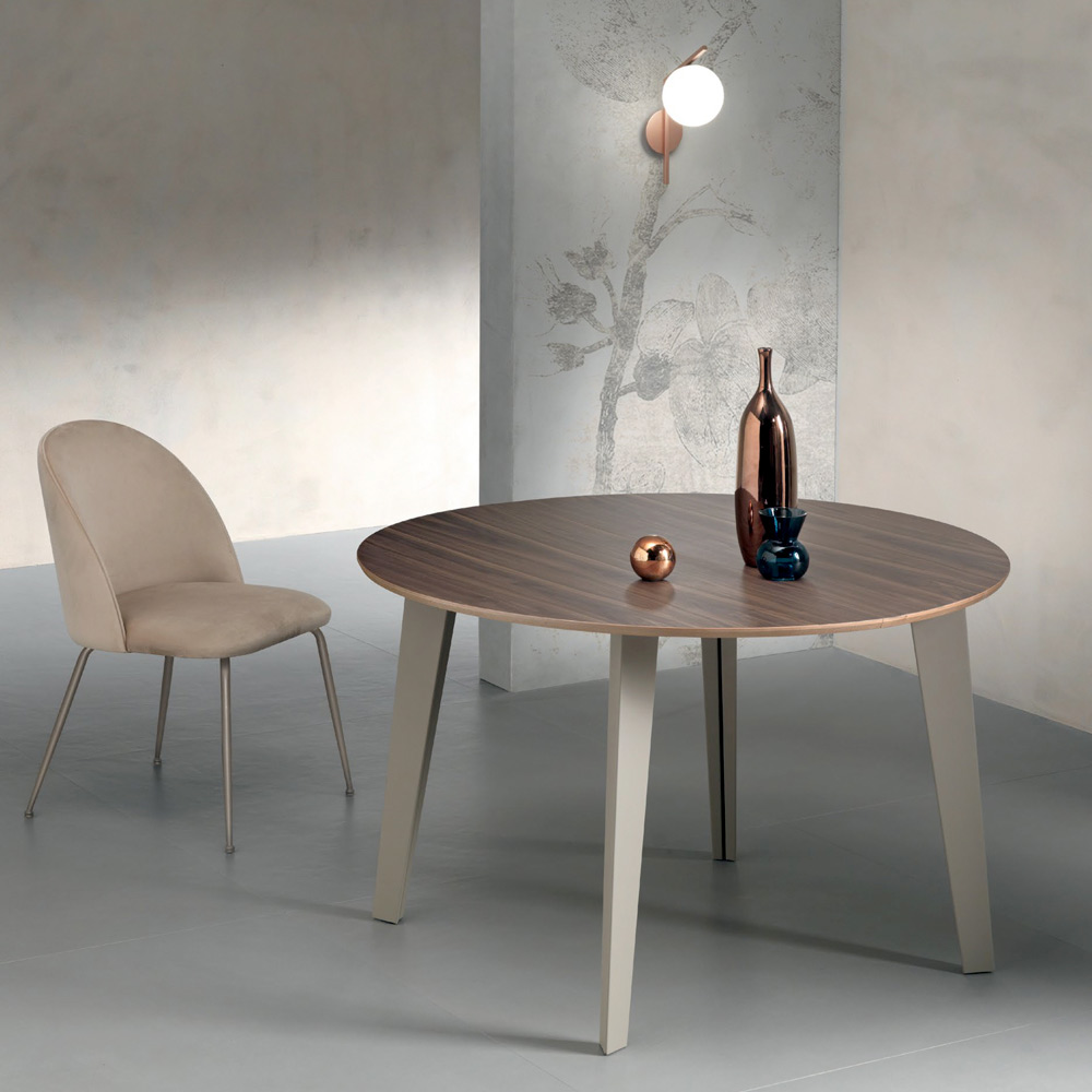 This table embodies timeless elegance and versatility, perfect for those seeking a designer piece that combines sophistication and functionality. Crafted from fine Canaletto walnut veneer, the round top extends, making it ideal for intimate dinners or larger gatherings. The natural finish enhances the beauty of the wood , lending warmth and brightness to the space. The slim 20 mm thickness and the modern lines of the base, featuring a solid and contemporary structure , offer a perfect contrast that enriches any space.