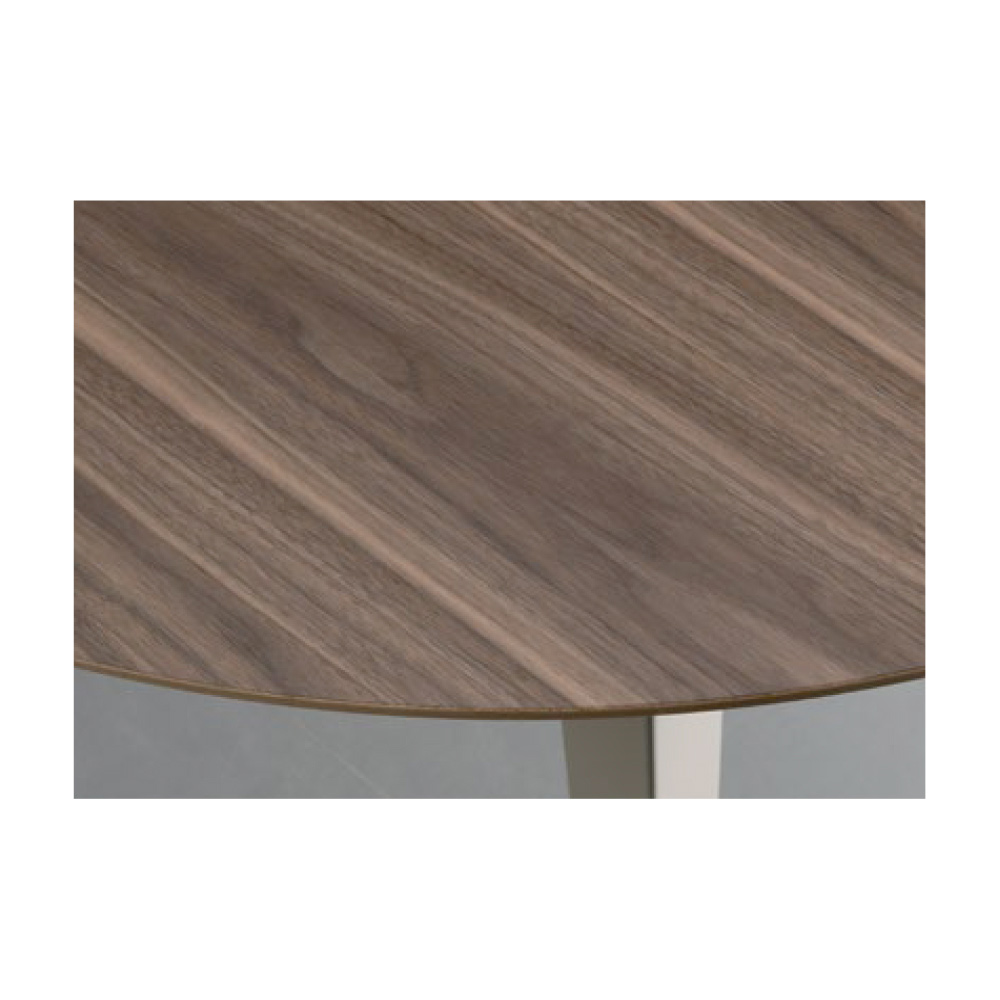 Round table, diameter 120 cm, extendable to 276 or 380 cm, with 20 mm thick Canaletto walnut veneer top and inclined profile.