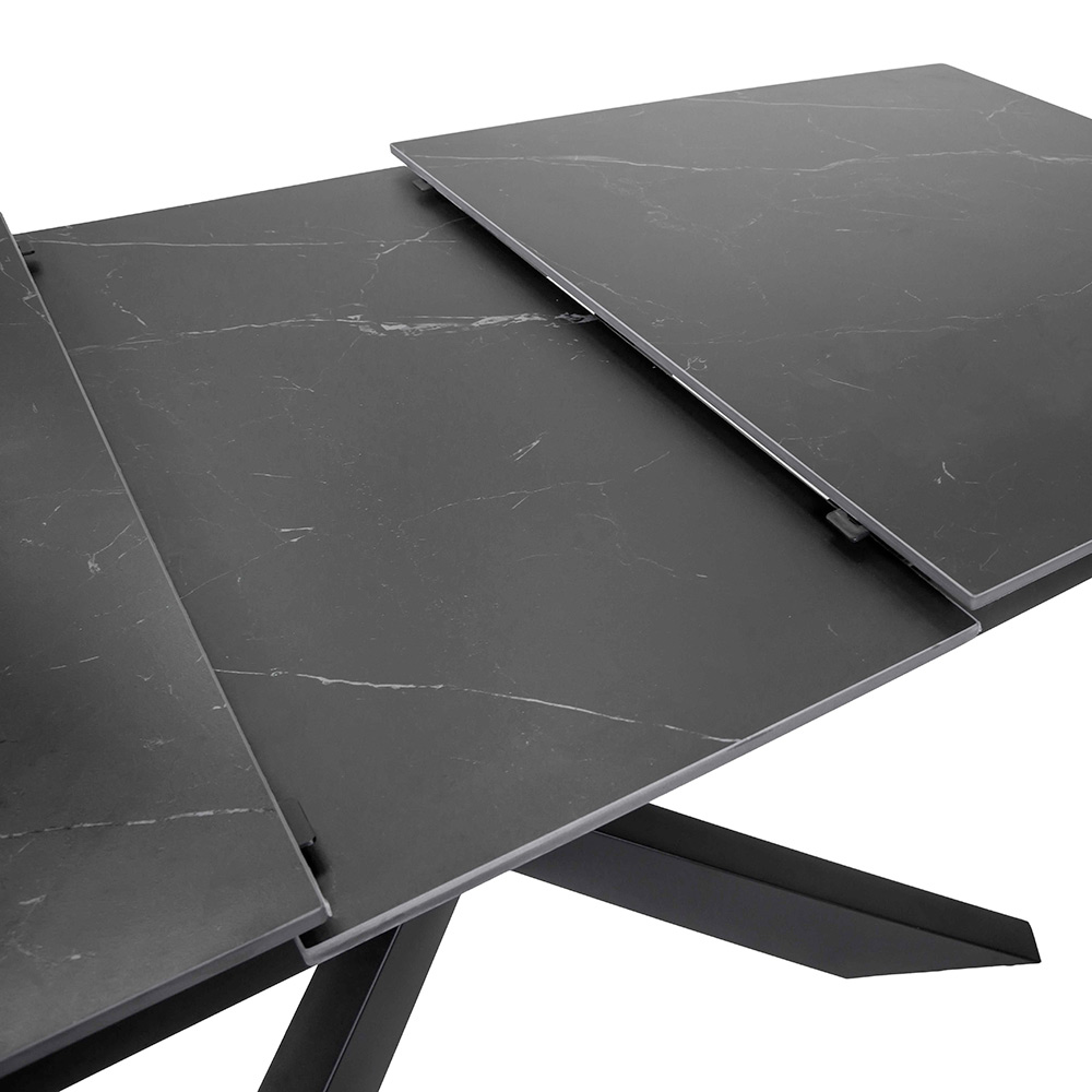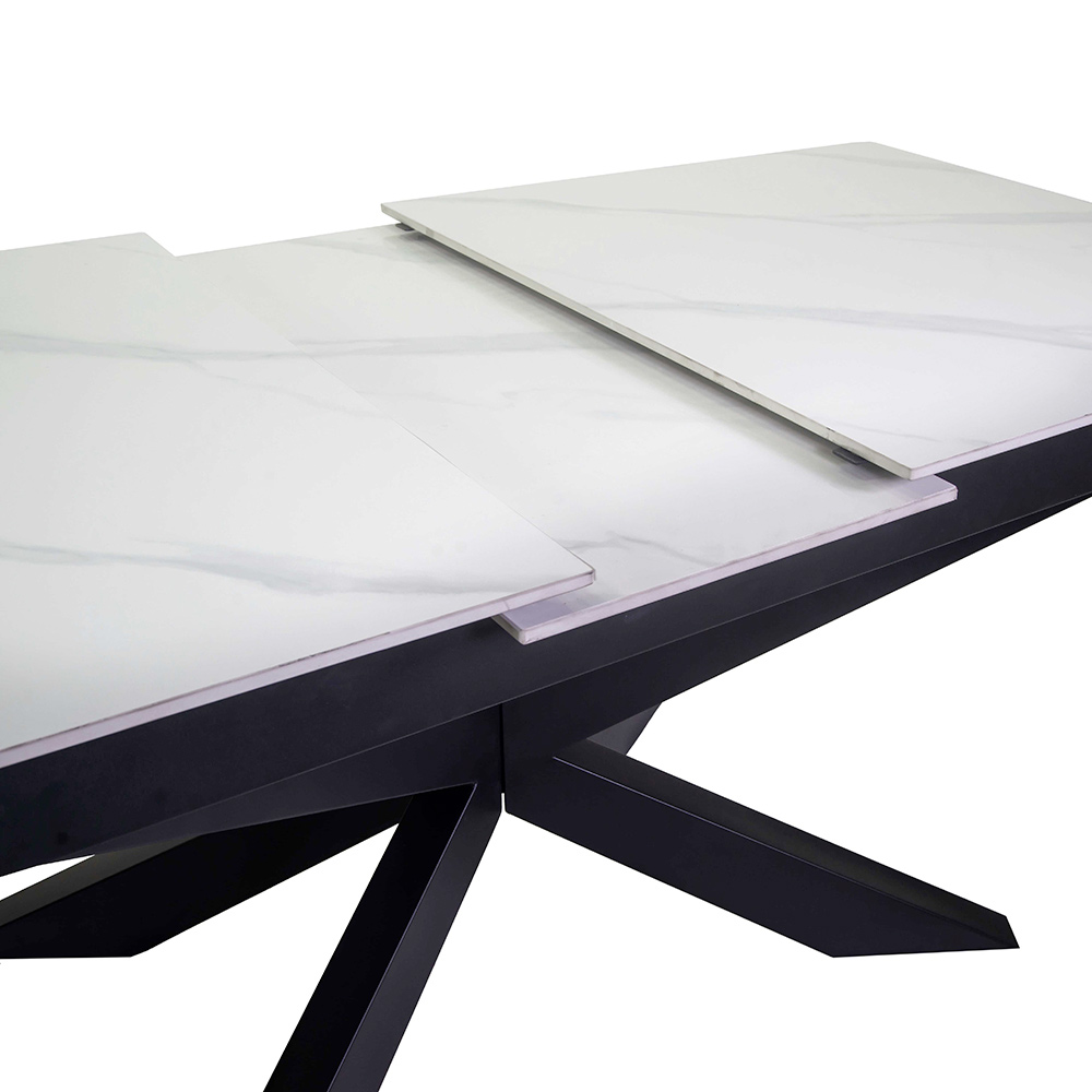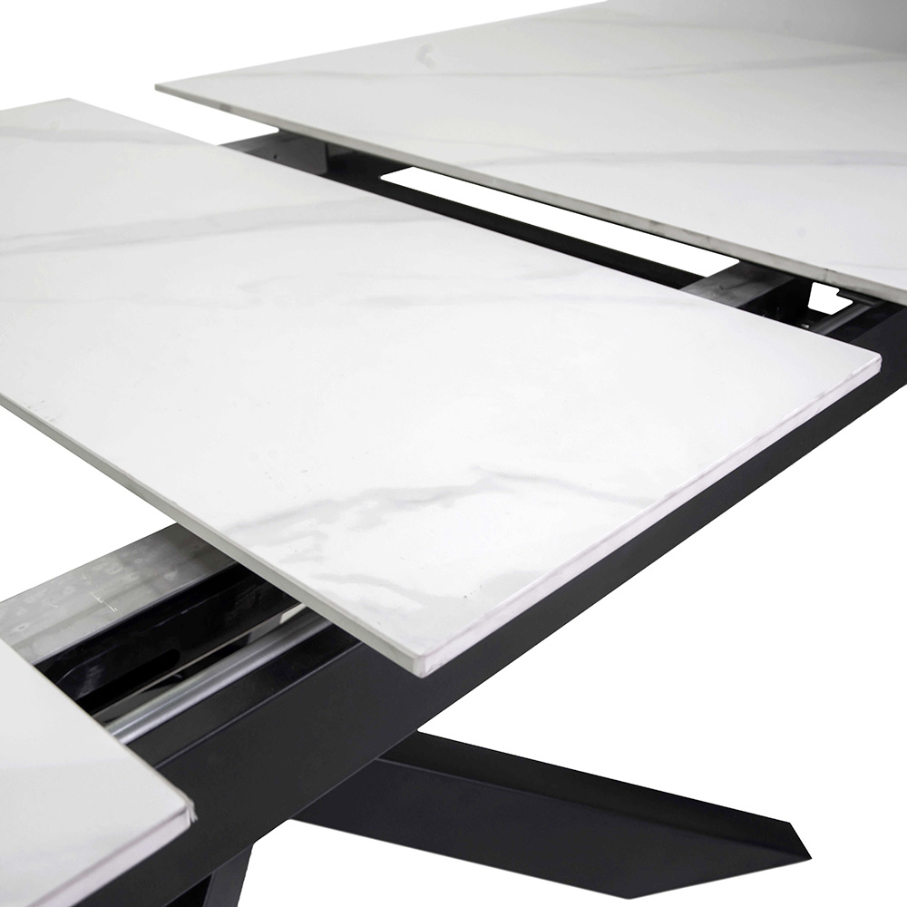 Dining table made with metal frame and synthesized stone top. The table is extendable with central opening.