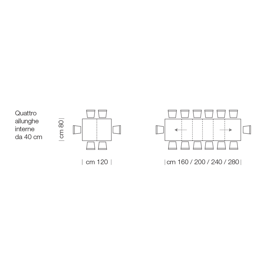 - L 120 (280) x D 80 x H 77 cm 14 seater extendable with four 40cm internal extensions;