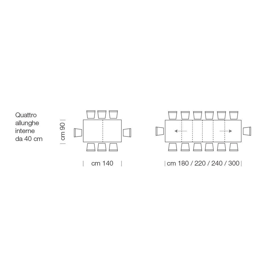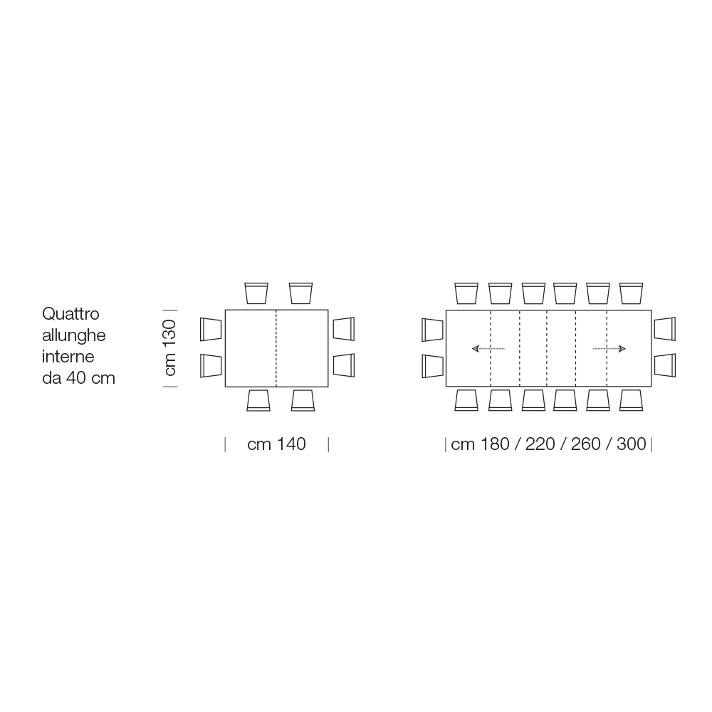 - L 140 (300) x D 130 x H 77 cm 16-seater extendable with four 40cm internal extensions;