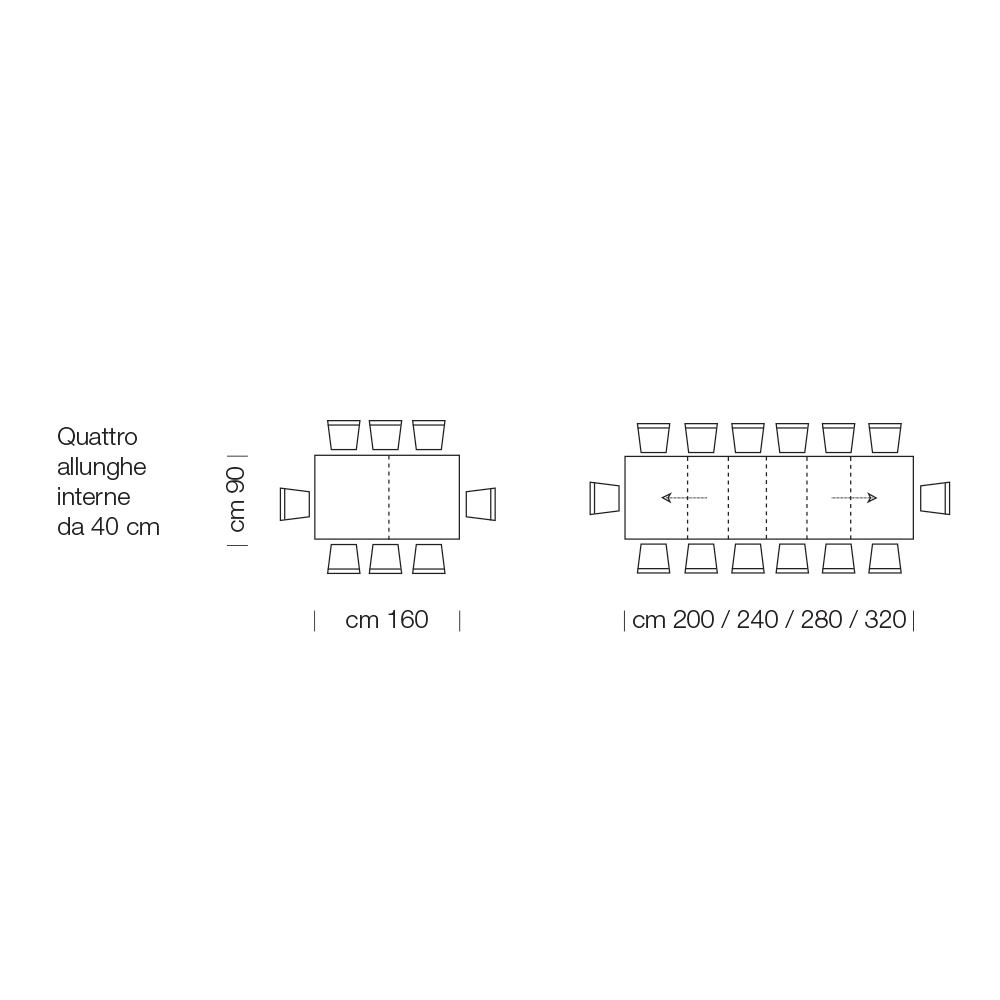 - L 160 (320) x D 90 x H 77 cm 14 seater extendable with four 40cm internal extensions;