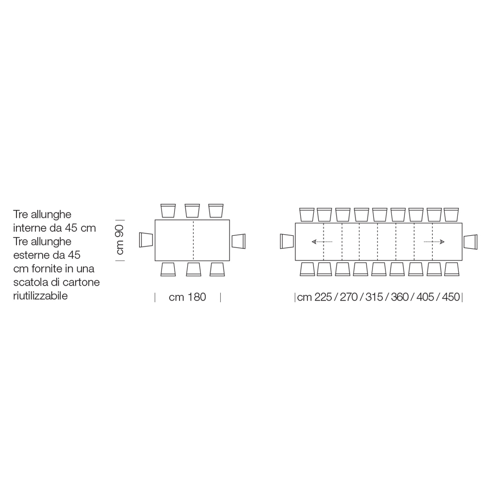 - L 180 (450) x D 90 x H 77 cm 20 seater extendable with six 45cm extensions, three internal and three supplied in a reusable cardboard box;