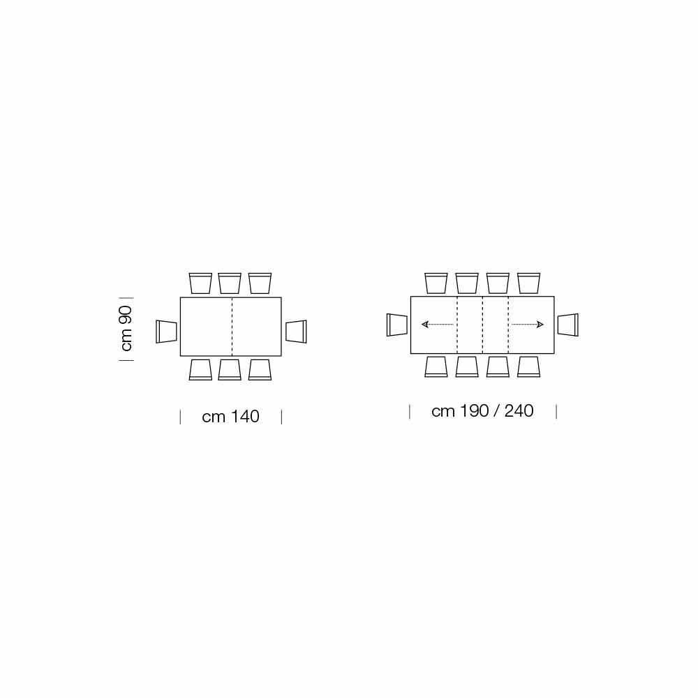 - L 140 (410) x D 90 x H 75.3 cm 18 seats extendable with three internal extensions of 45cm each and three external extensions of 45cm each;