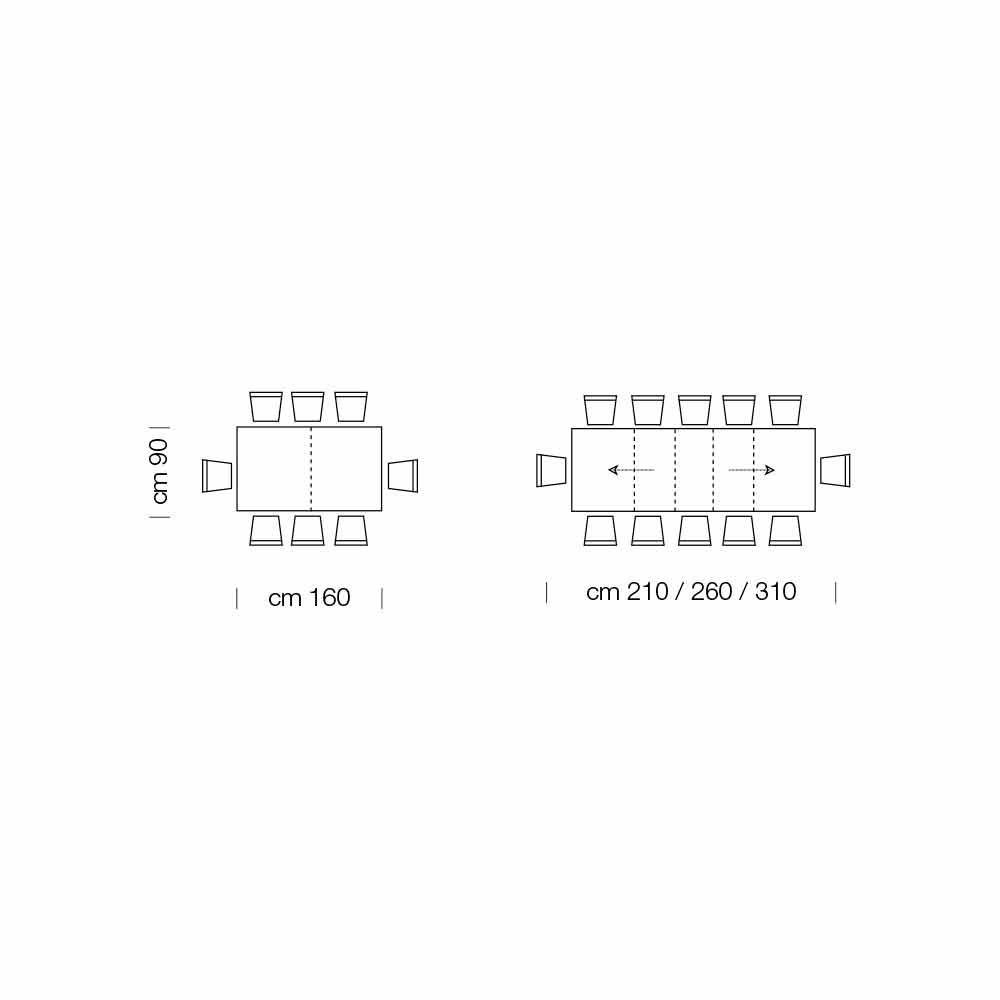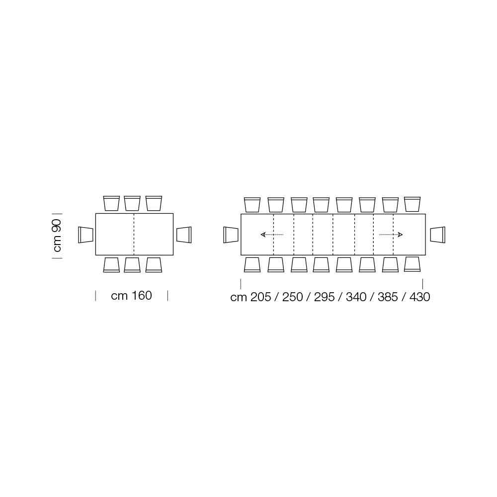 - L 160 (430) x D 90 x H 75.3 cm 18 seats extendable with three internal extensions of 45cm each and three external extensions of 45cm each;