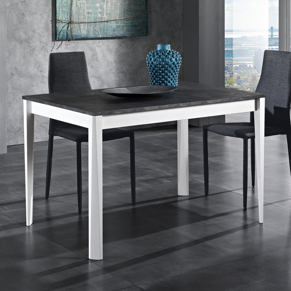 Dining table with extendable melamine top (thickness 22 mm) and legs in white matt lacquered solid beech wood , made in Italy . A carefully designed piece of furniture to best express current trends in the field of furniture and daily living. An extraordinarily rich aesthetic, where each element embodies unique characteristics, in the name of an always refined, innovative and never banal style. The fundamental aspect is the perfect balance between design and practicality, which guarantees a very strong impact in every context.