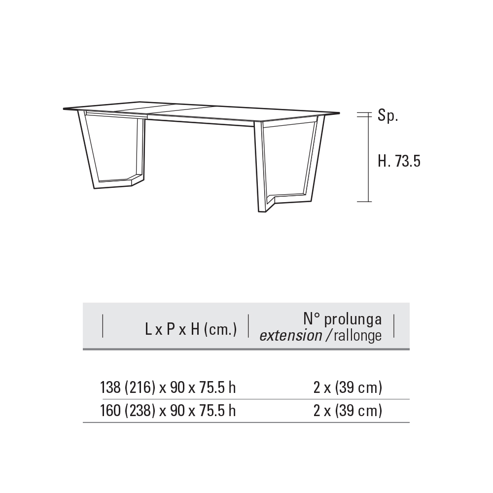 made in the same material as the top, they allow this piece of furniture to extend up to a maximum length of 238 cm, thus creating a