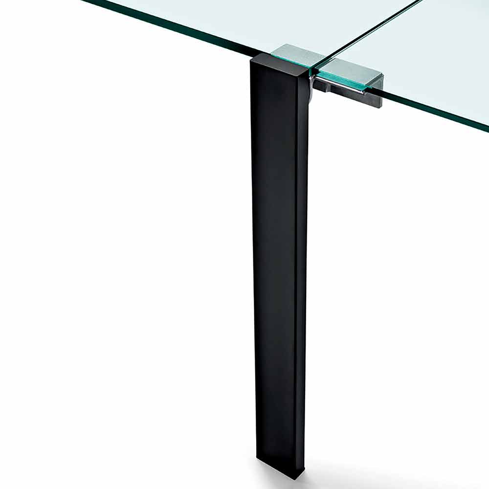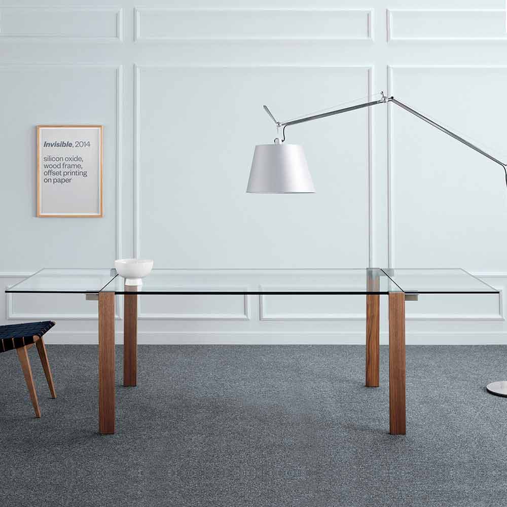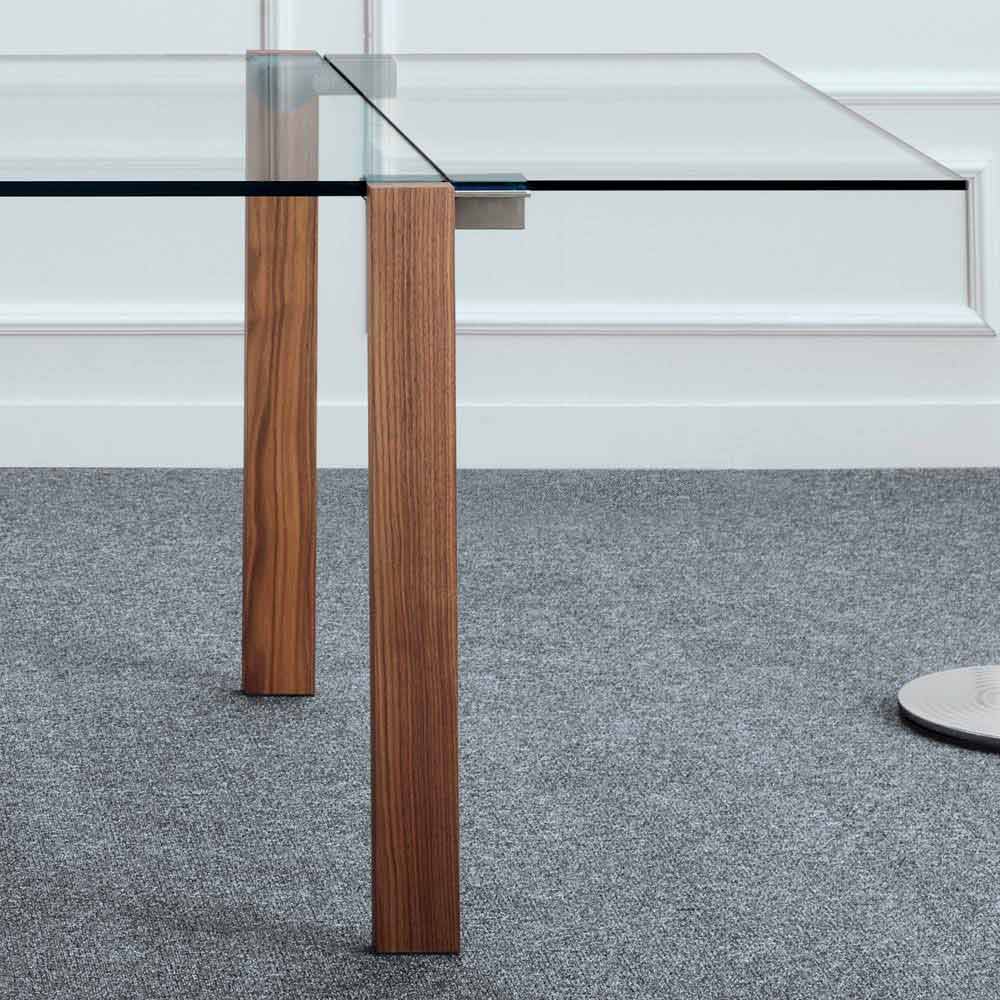 • top and extensions in transparent glass, legs in canaletto walnut.