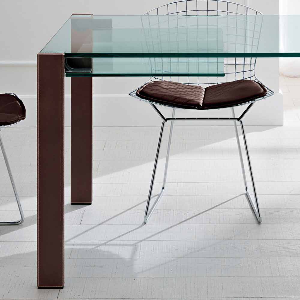• top and extensions in transparent glass, metal legs covered in dark brown leather;