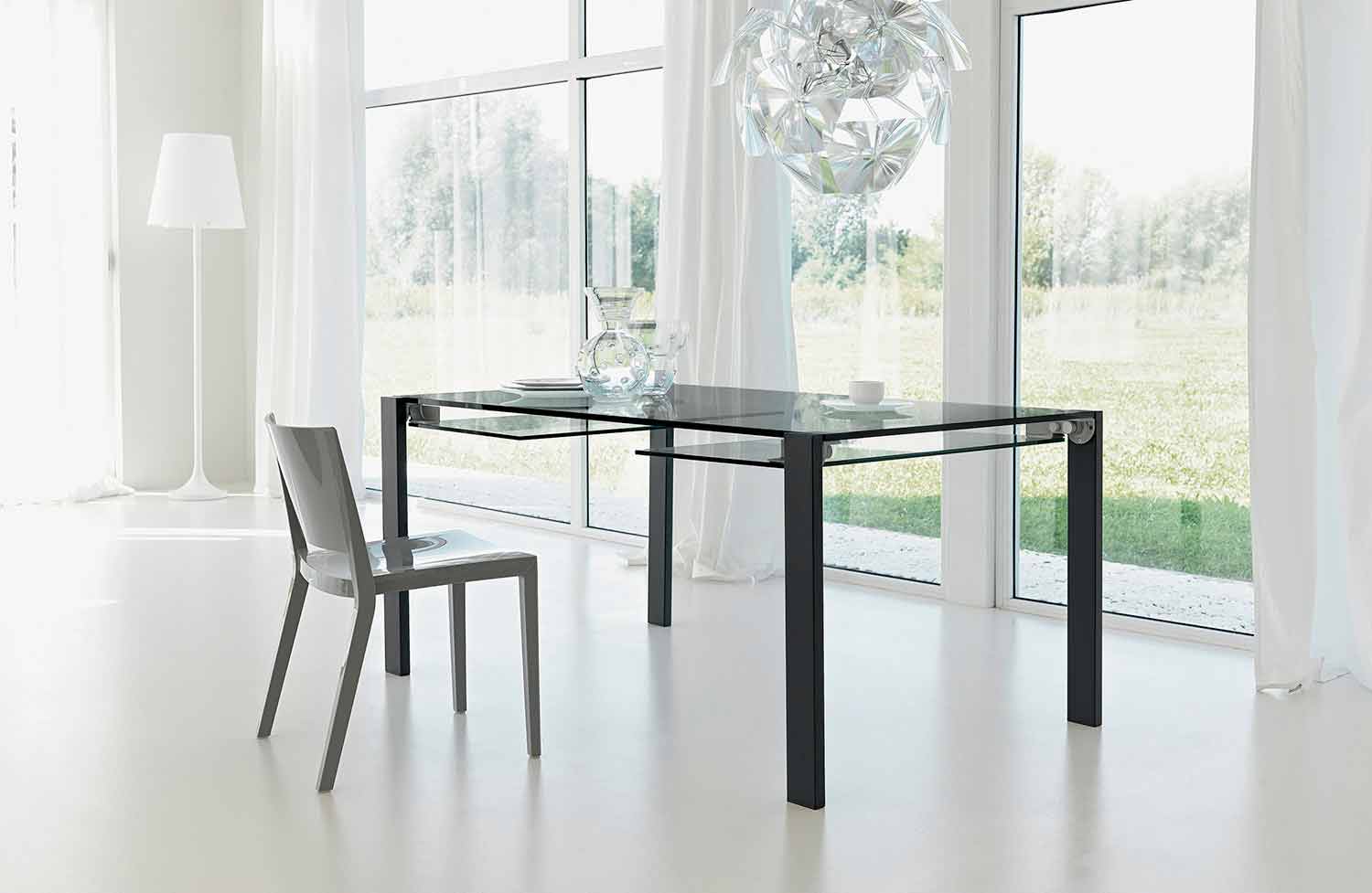 Transparent glass table extendable up to 12 places with metal or canaletto walnut base, made in Italy.