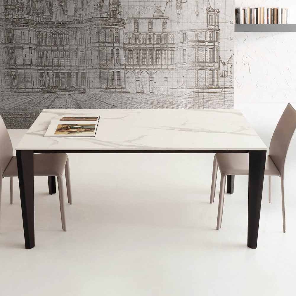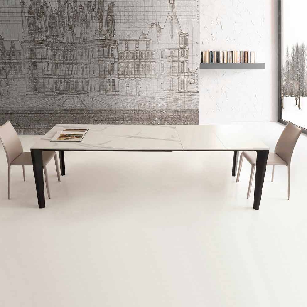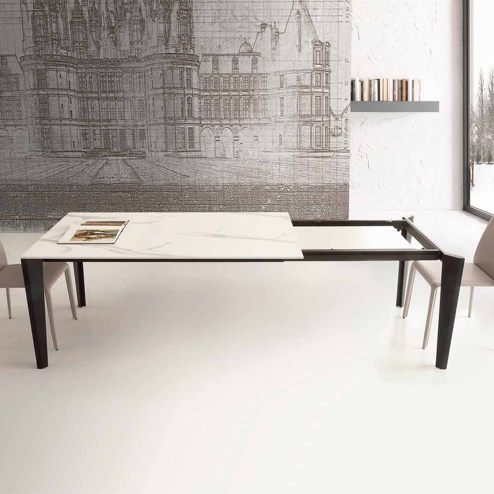Dining table made in Italy with extendable glass ceramic top (12mm thick) with Calacatta white marble effect finish, white melamine extension and black painted metal base.